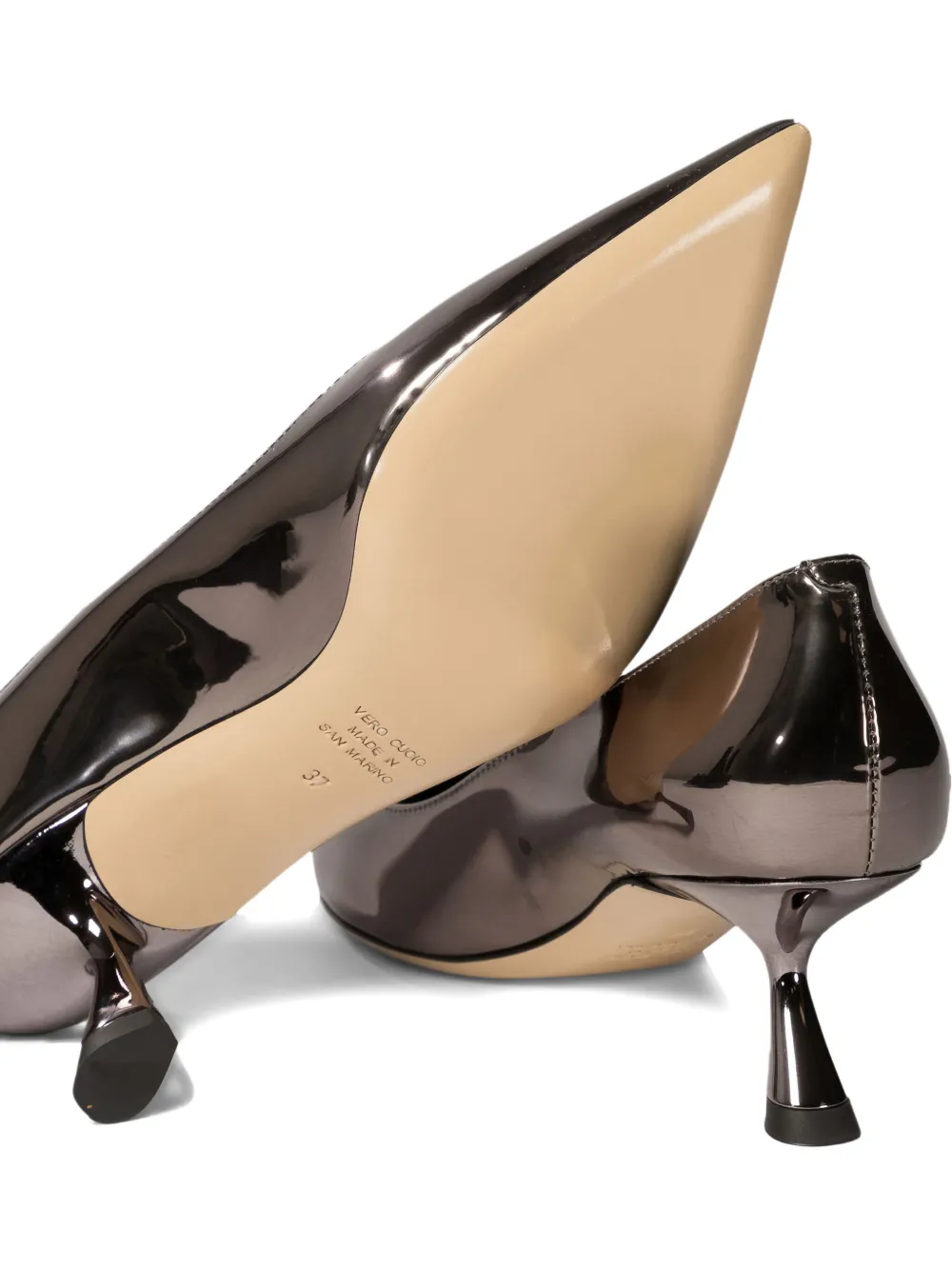 Туфли из серой зеркальной кожи с острым носком и скульптурным каблуком, без застежек