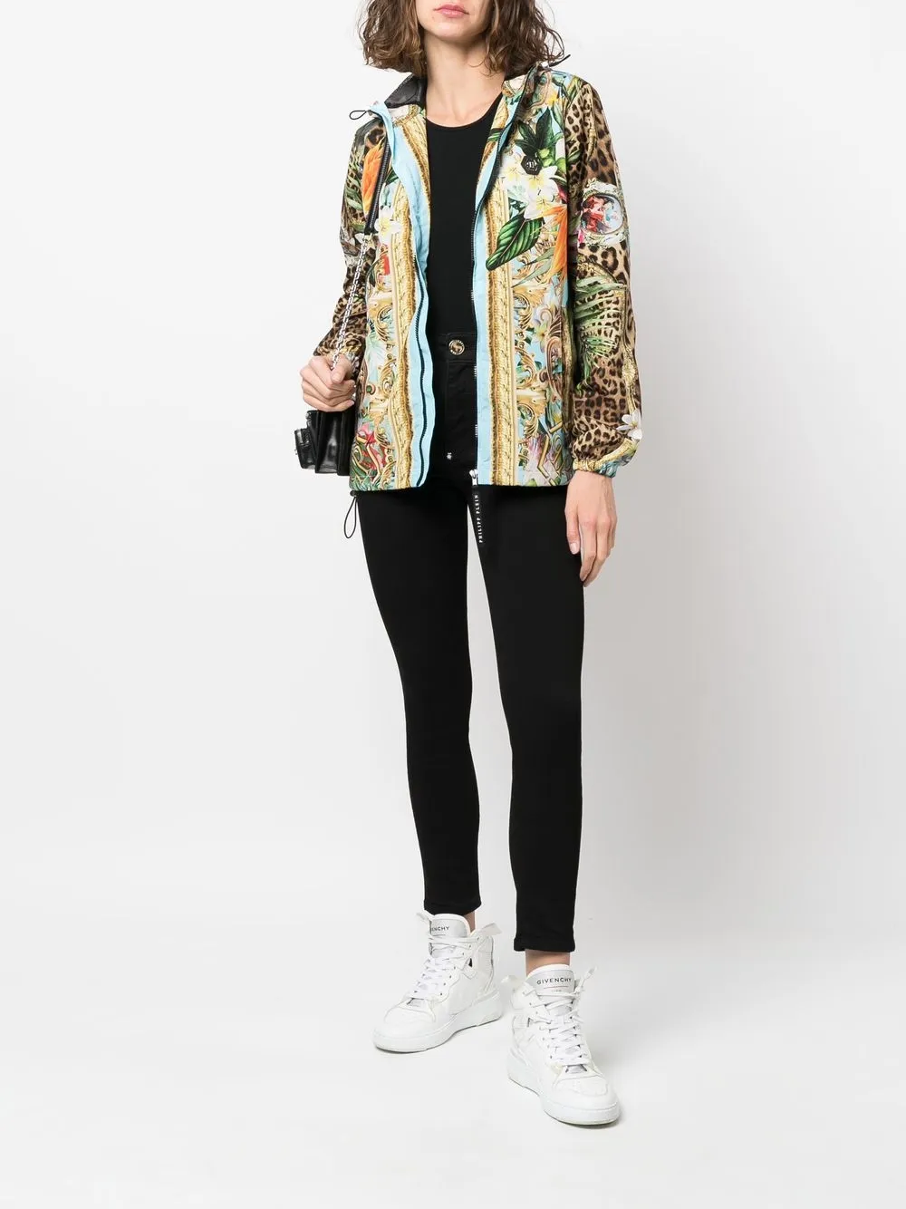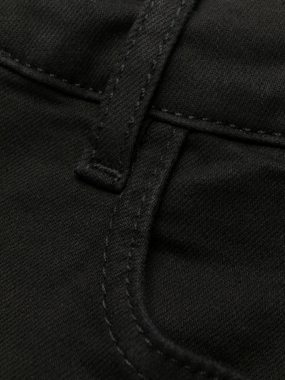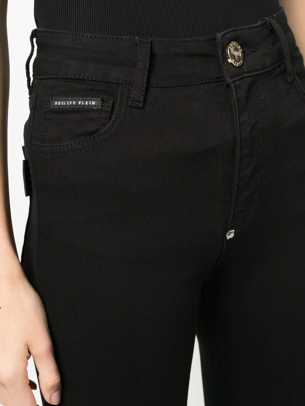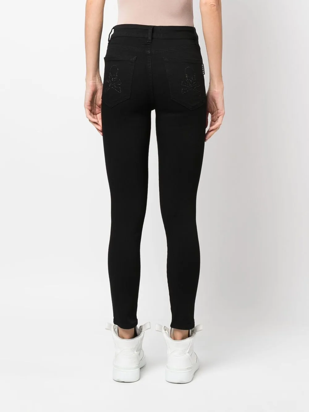 Принт с изображением черепа на тыльной стороне, завышенная линия талии, облегающий крой, застежка на молнии и пуговице спереди, петли для ремня, классическая пятикарманная модель и эластичная модель.