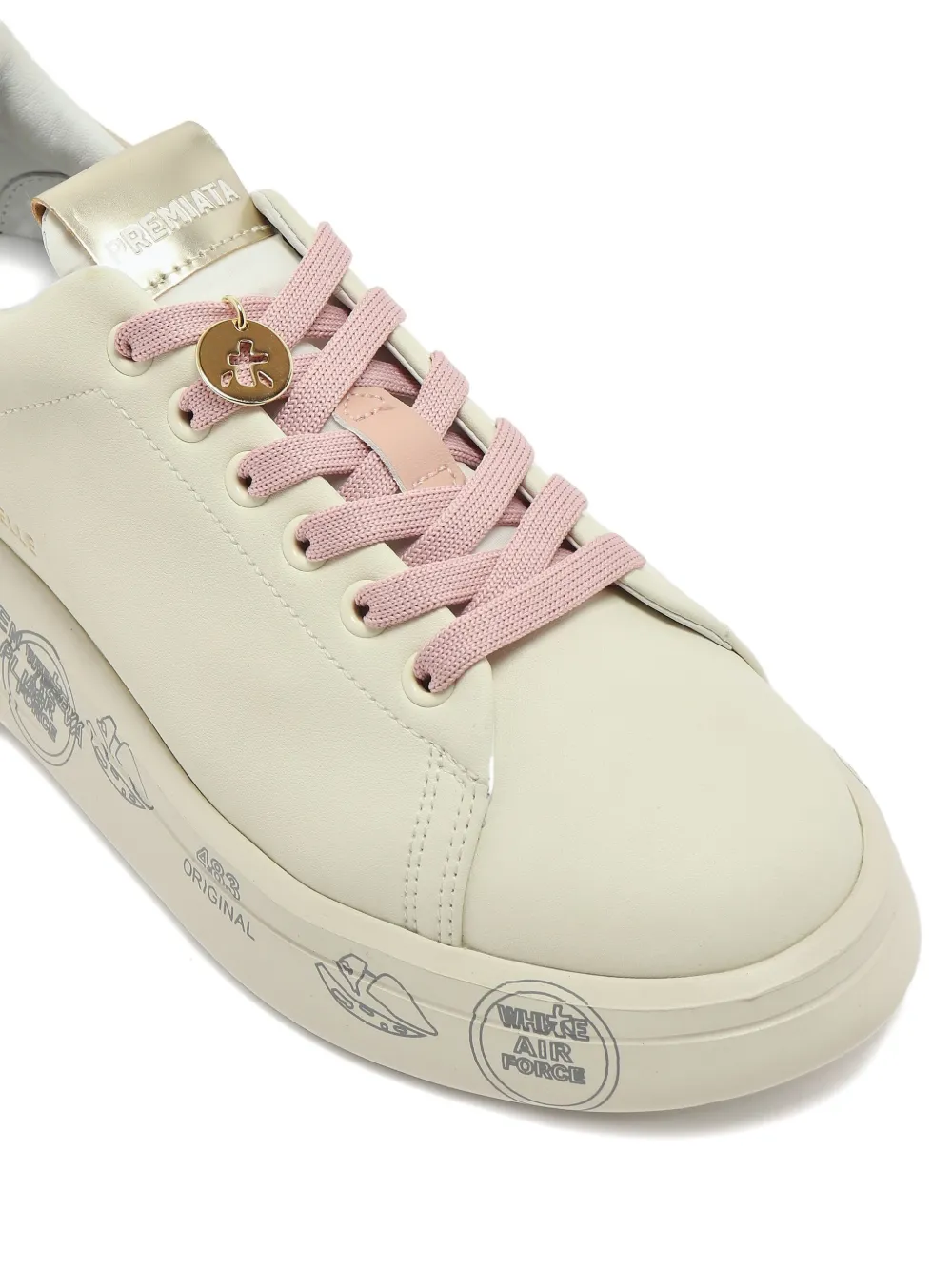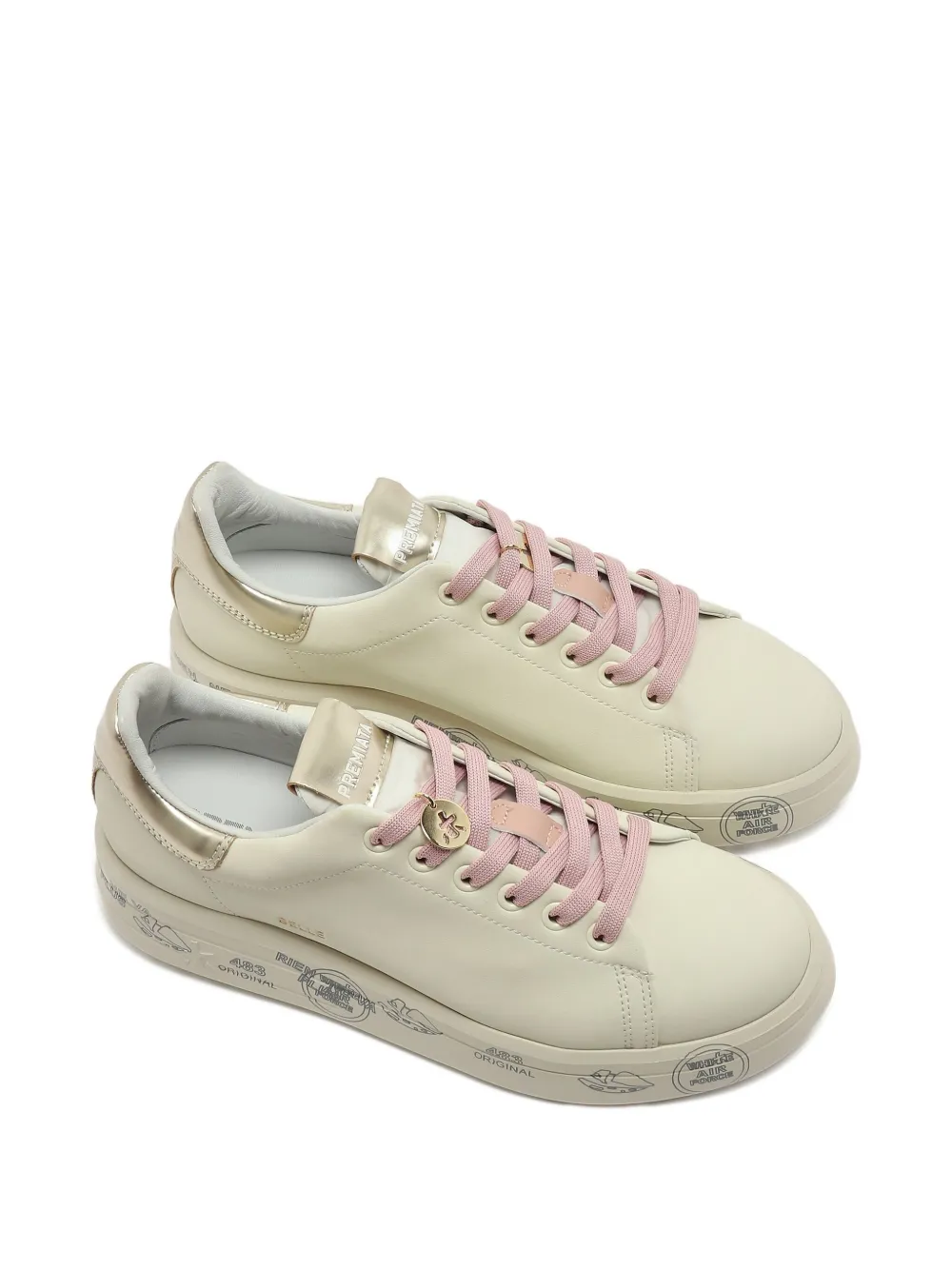 Верх из белой кожи, розовые шнурки, металлический каблук, графический принт на подошве, тисненый логотип