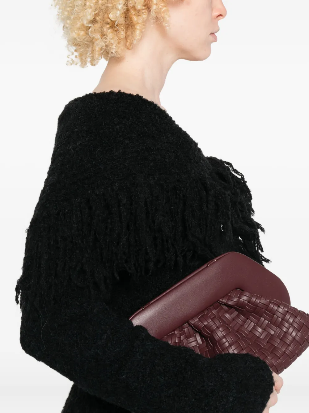 Черная бахрома, застежка на пуговицы, длинные рукава, вырез с открытыми плечами, фактурная вязка