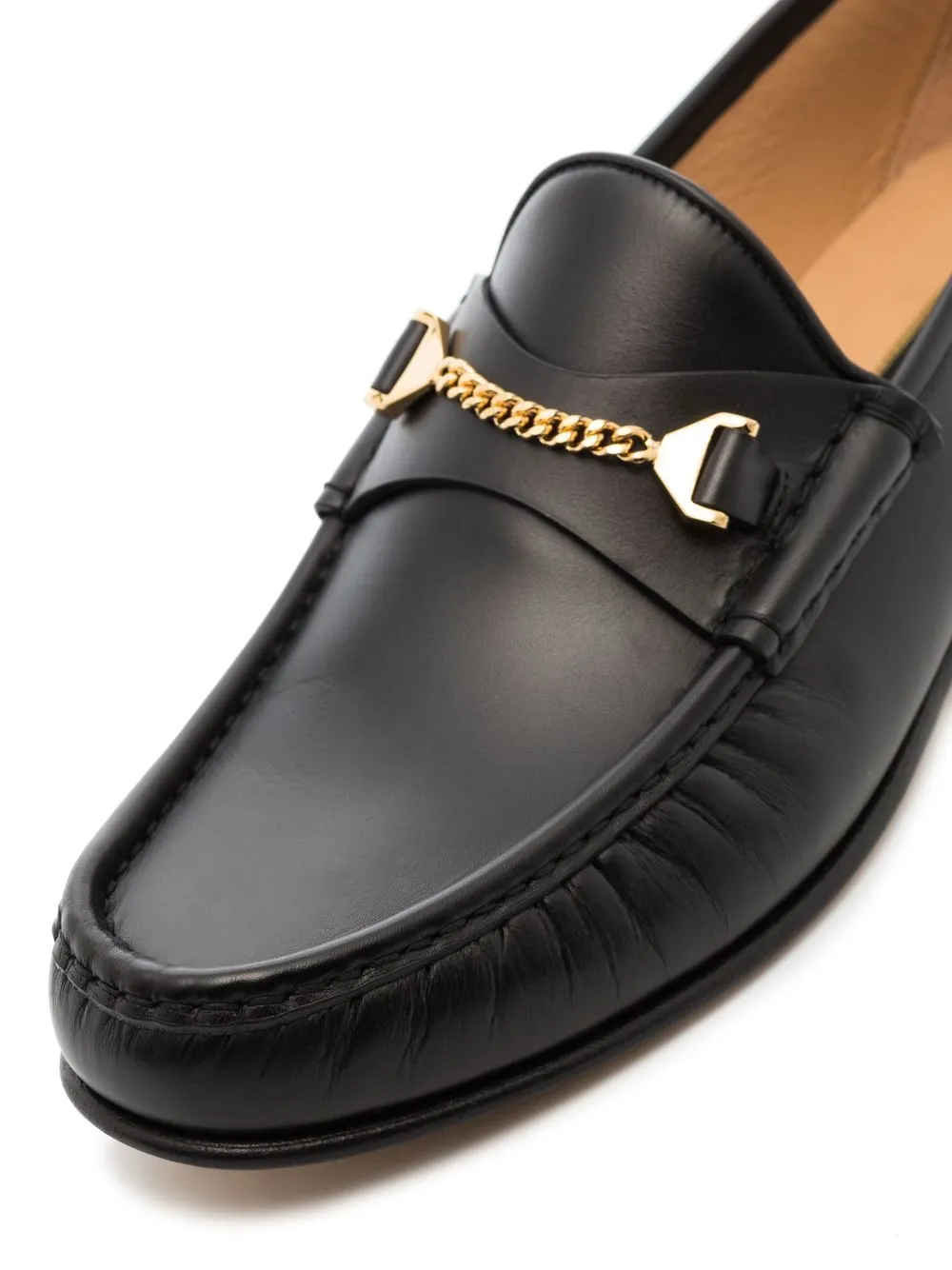 Черный, кожа, матовое покрытие, золотистая фурнитура, закругленный носок и кожаная стелька с логотипом.