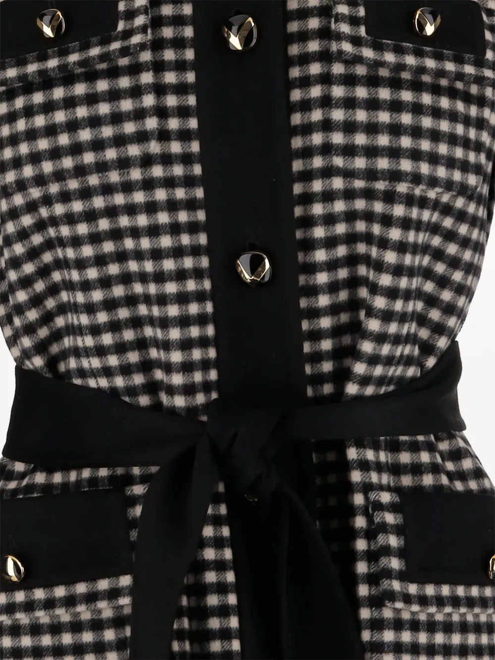 Черная шерстяная модель с клетчатым узором, застежка на пуговицы, длинные рукава.