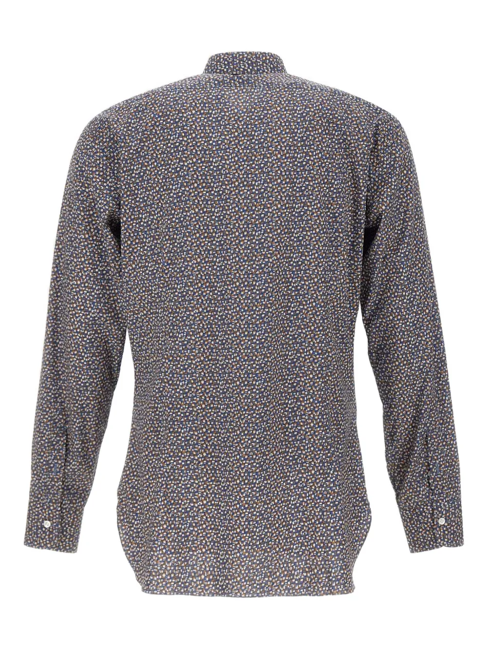 Серый микрооптический узор, классический воротник, длинные рукава, закругленный подол.