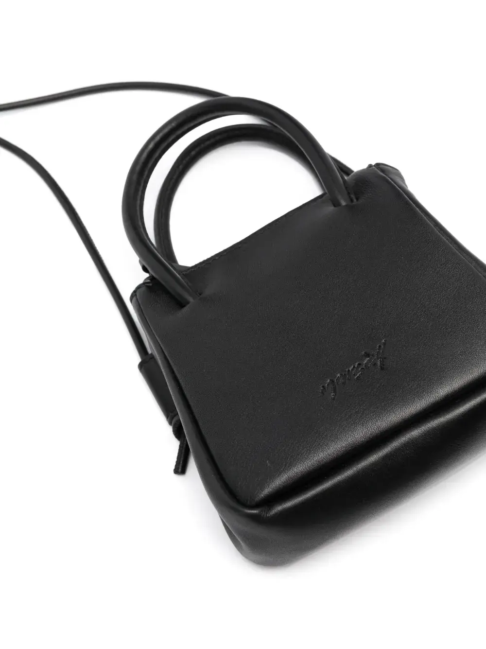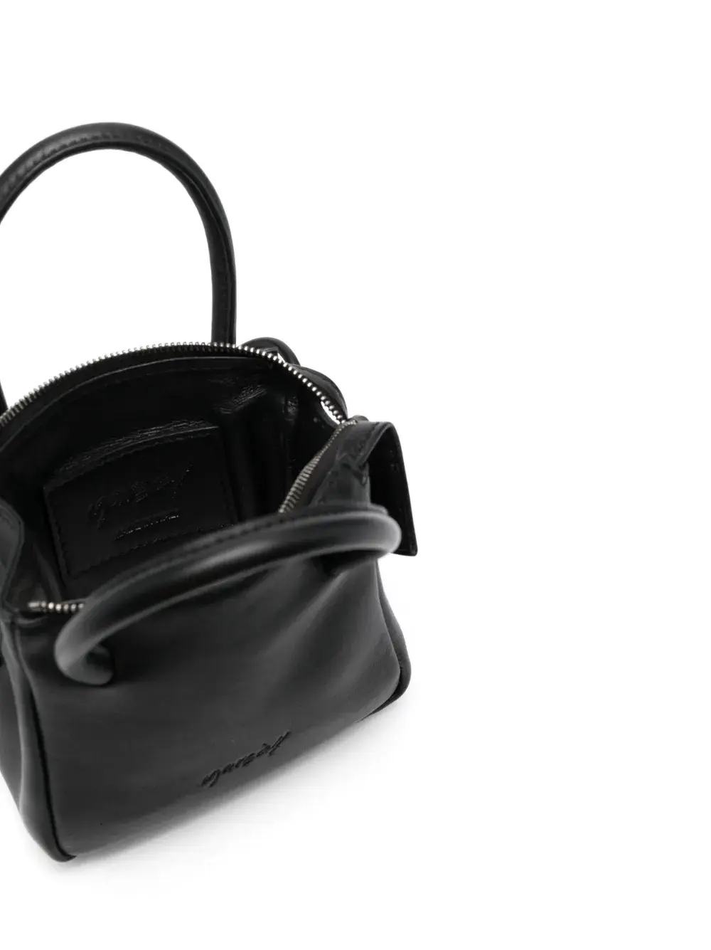 Черный, телячья кожа, зернистая текстура, тисненый логотип спереди, строчка в тон, застежка на молнии сверху, съемный регулируемый ремень на плечо, две закругленные верхние ручки, основное отделение и нашивка с логотипом внутри.