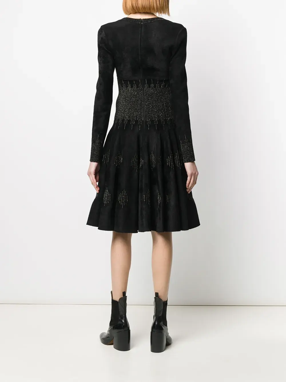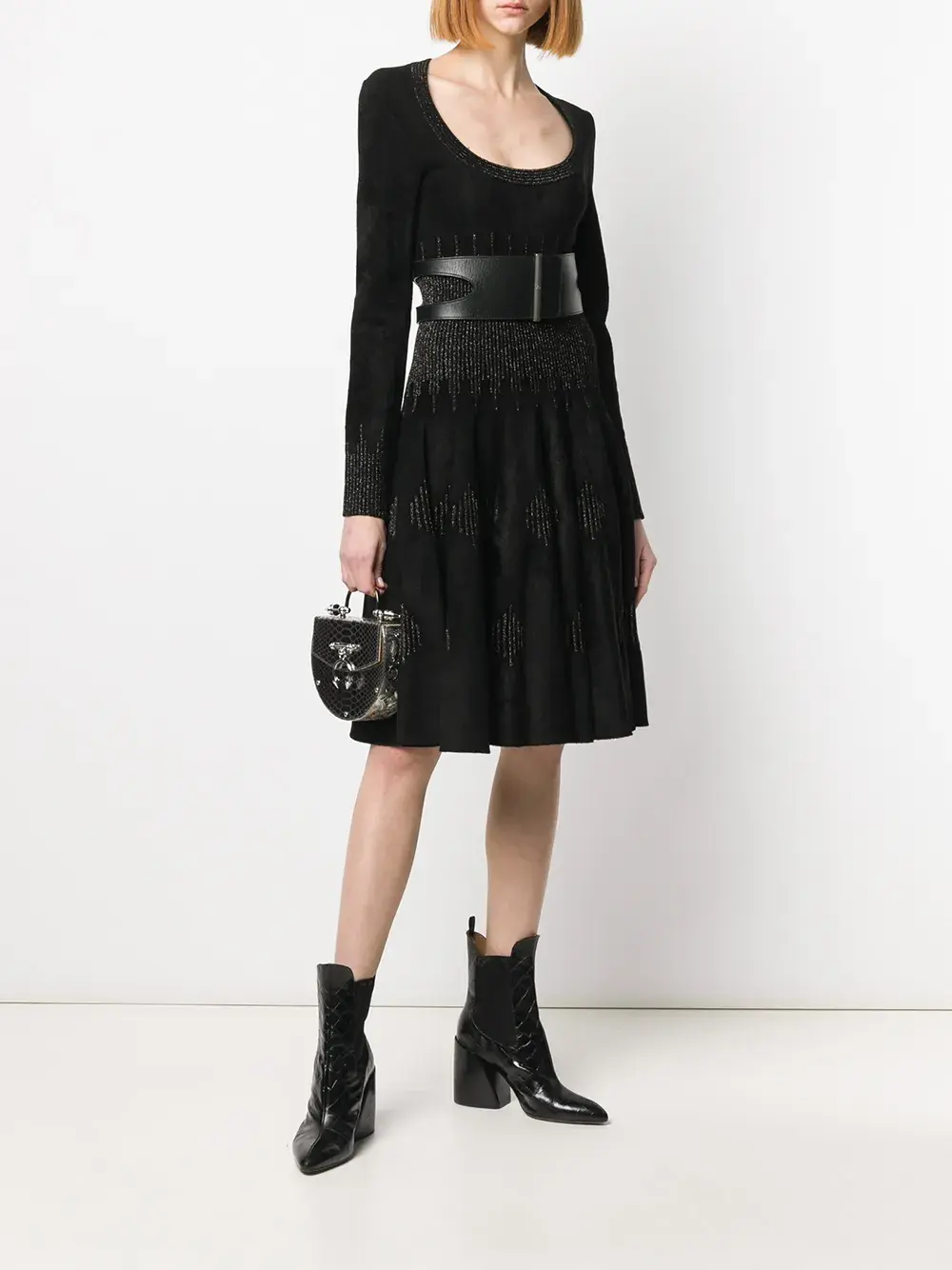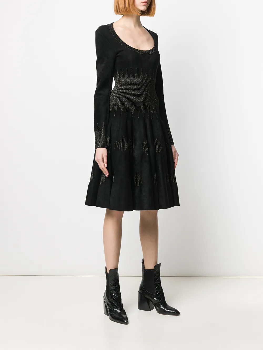 Платье миди от Alaïa. Потайная застежка на молнии сзади, вырез-ковш, длинные рукава, детали с блестками, фактурная модель и длина по колено. Цвет: черный. Обратите внимание, что это товар с историей. Несмотря на отличное состояние, он может иметь незначительные дефекты. Купив эту вещь, вы дадите ей вторую жизнь и внесете вклад в будущее планеты.