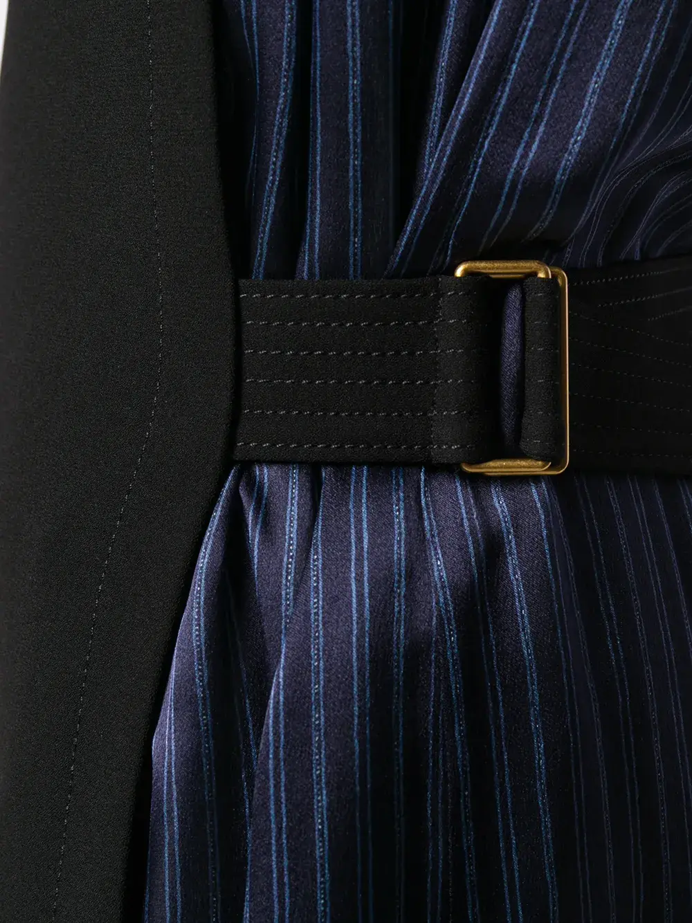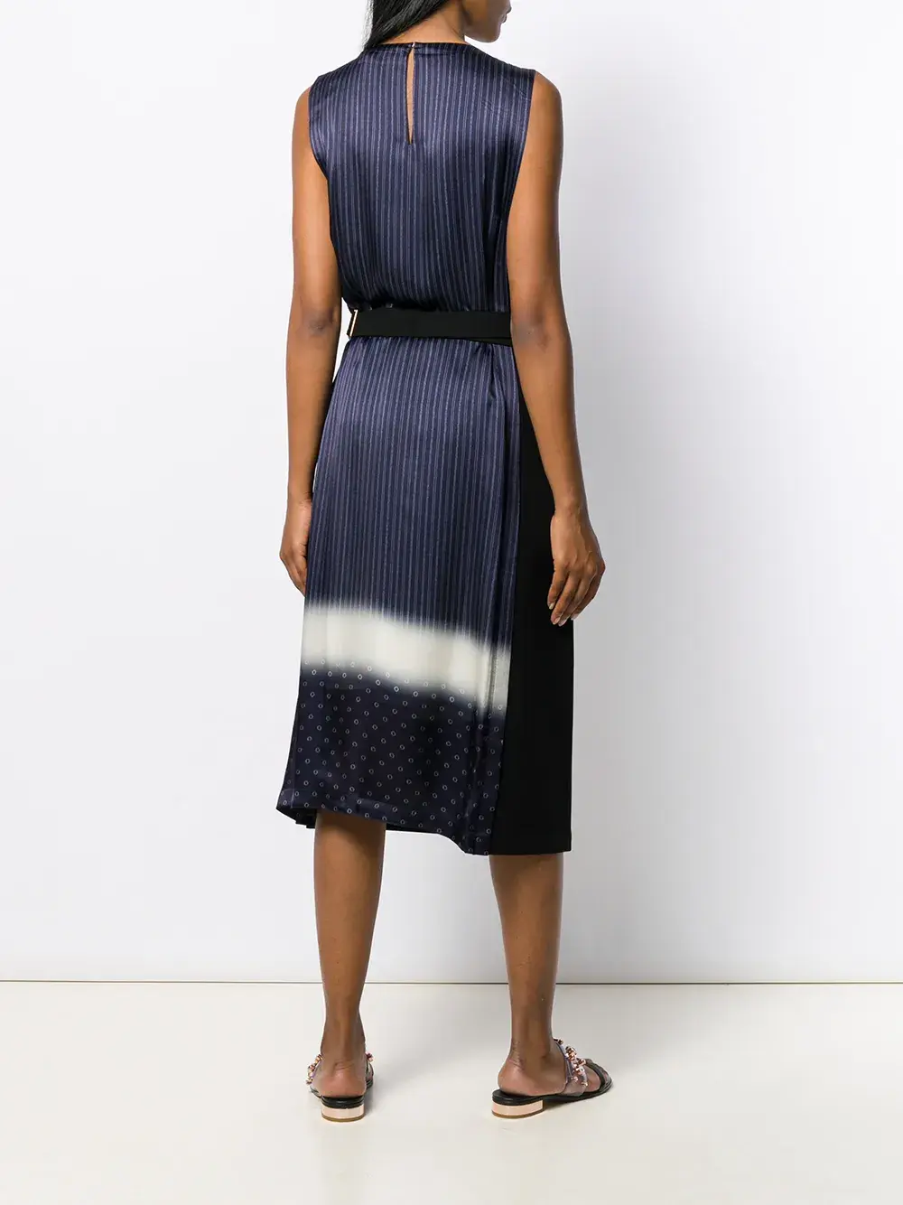 Платье миди со вставкой в полоску от Tory Burch (Тори Берч). Задняя застежка на пуговице, вырез-лодочка, модель без рукавов, ремень на талии и свободный крой. Цвет: черный.