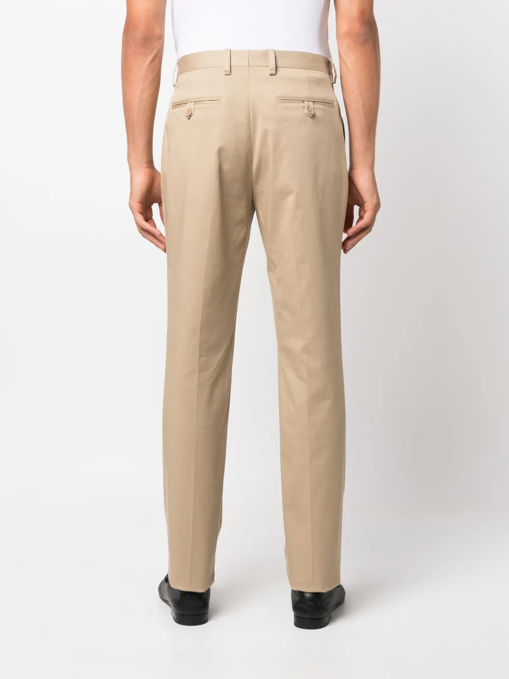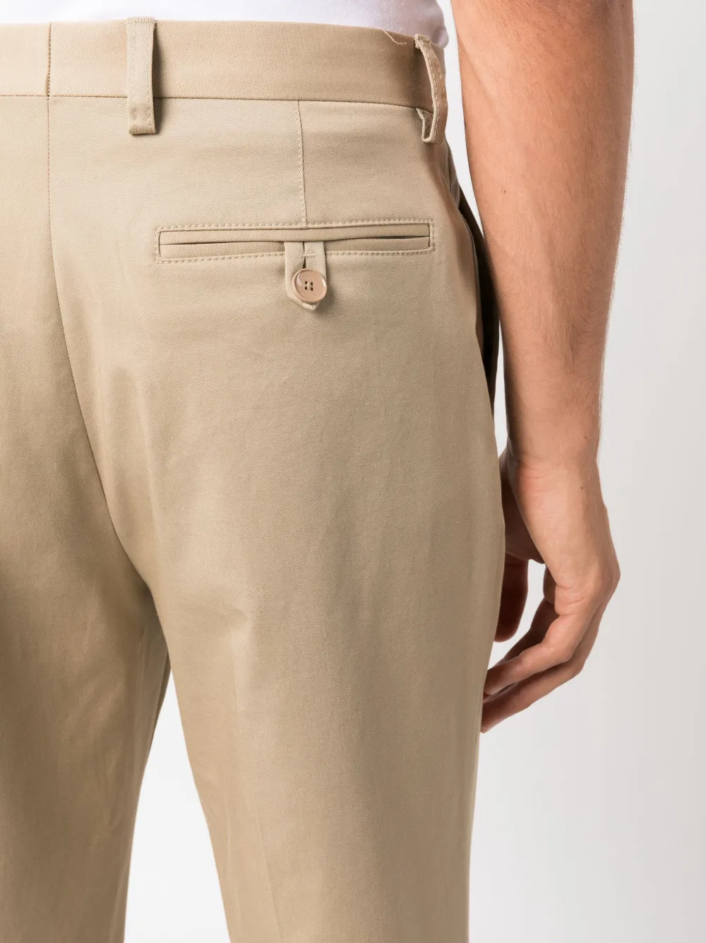 Бежевый, эластичный хлопок, стрелки, средняя посадка, петли для ремня, застежка на молнии и пуговице спереди, прямой крой, два вшитых кармана по бокам и два прорезных кармана на пуговицах сзади.