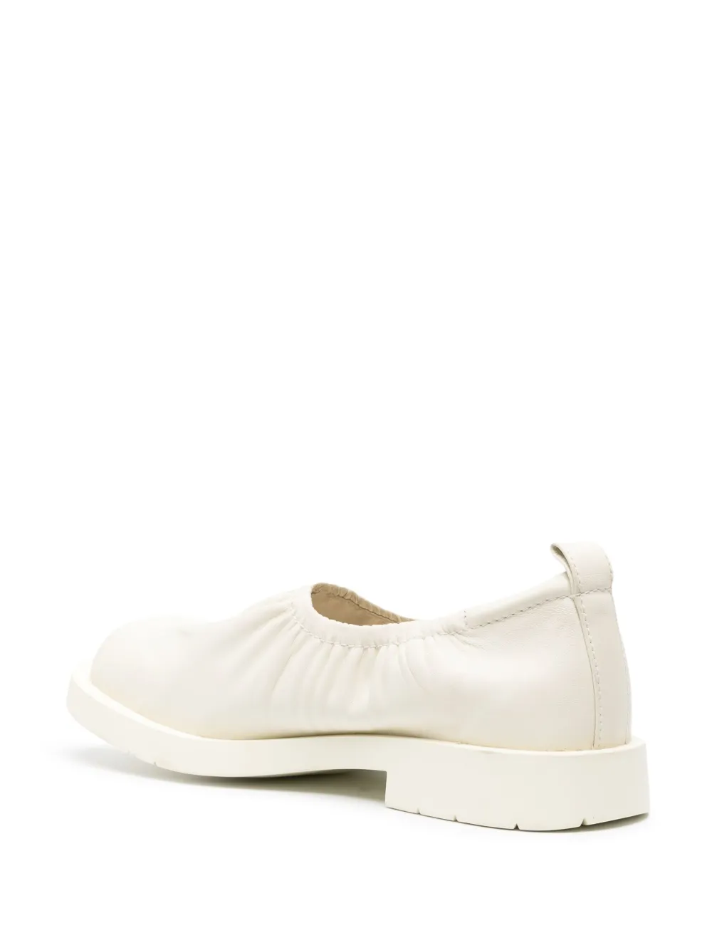 Цвет слоновой кости, телячья кожа, однотонная расцветка, дизайн со сборками, модель без застежки, петля для подтягивания сзади, квадратный носок, кожаная подкладка, кожаная стелька с логотипом и массивная резиновая подошва.
