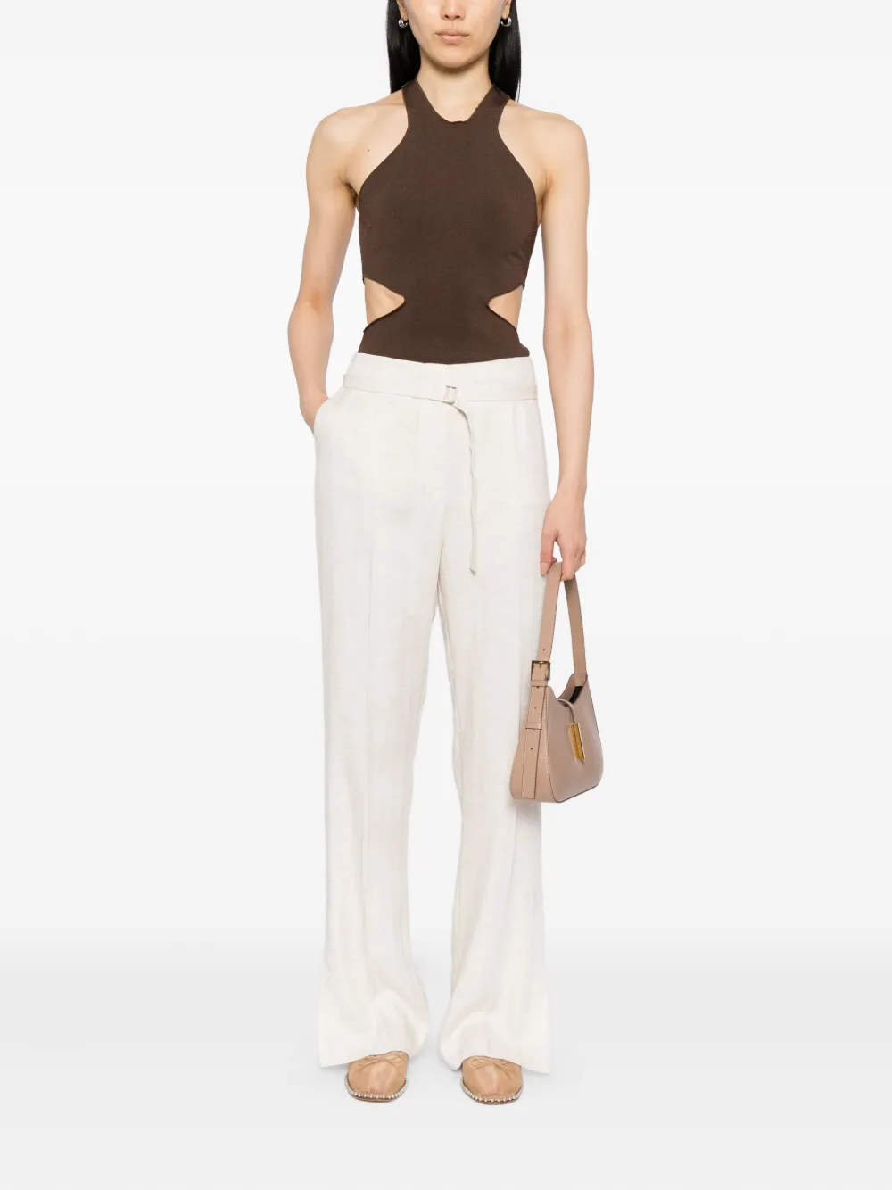 Застежка-молния сбоку серо-коричневого цвета, съемный пояс на талии, два боковых прорезных кармана.