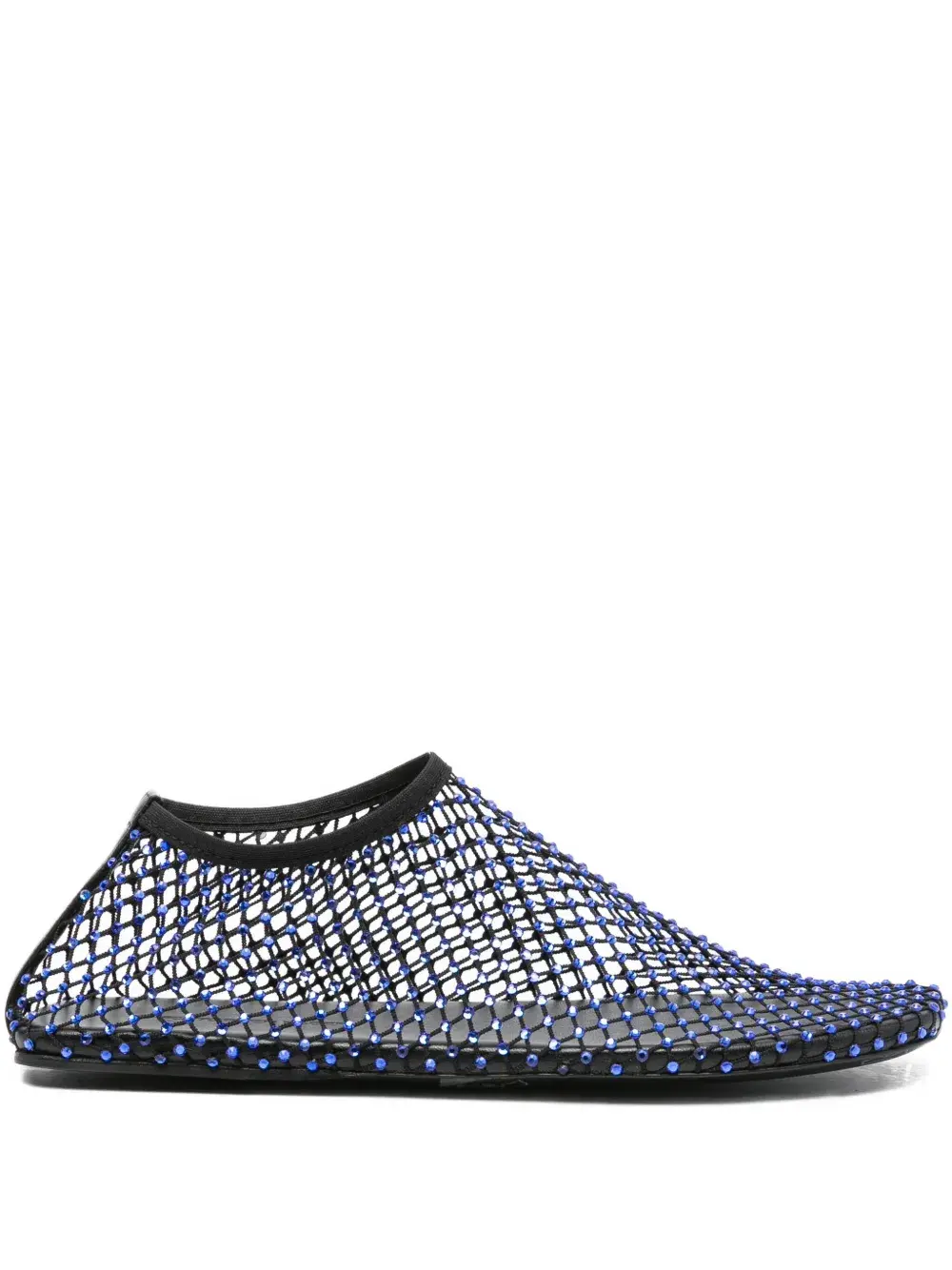 Верх из черной сетки, синие кристаллы, плоская подошва, квадратный носок.