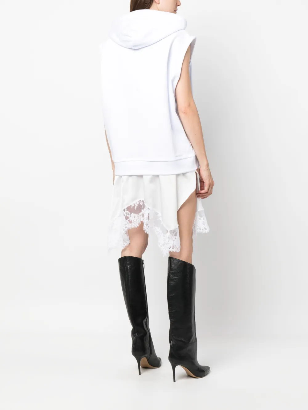 Белый/черный, хлопок, принт с логотипом на груди, кружевная отделка, затягивающийся на шнурок капюшон, карман-муфта, без рукавов, боковой разрез и длина выше колена.