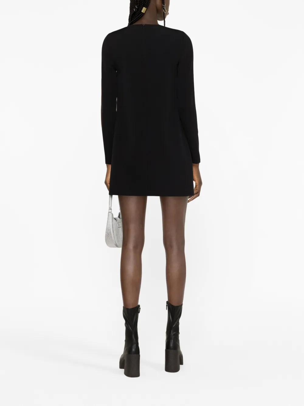 Черный/разноцветный, сплошной принт с логотипом, цепочный принт, круглый вырез, потайная застежка на молнии сзади, длинные рукава и прямой подол.