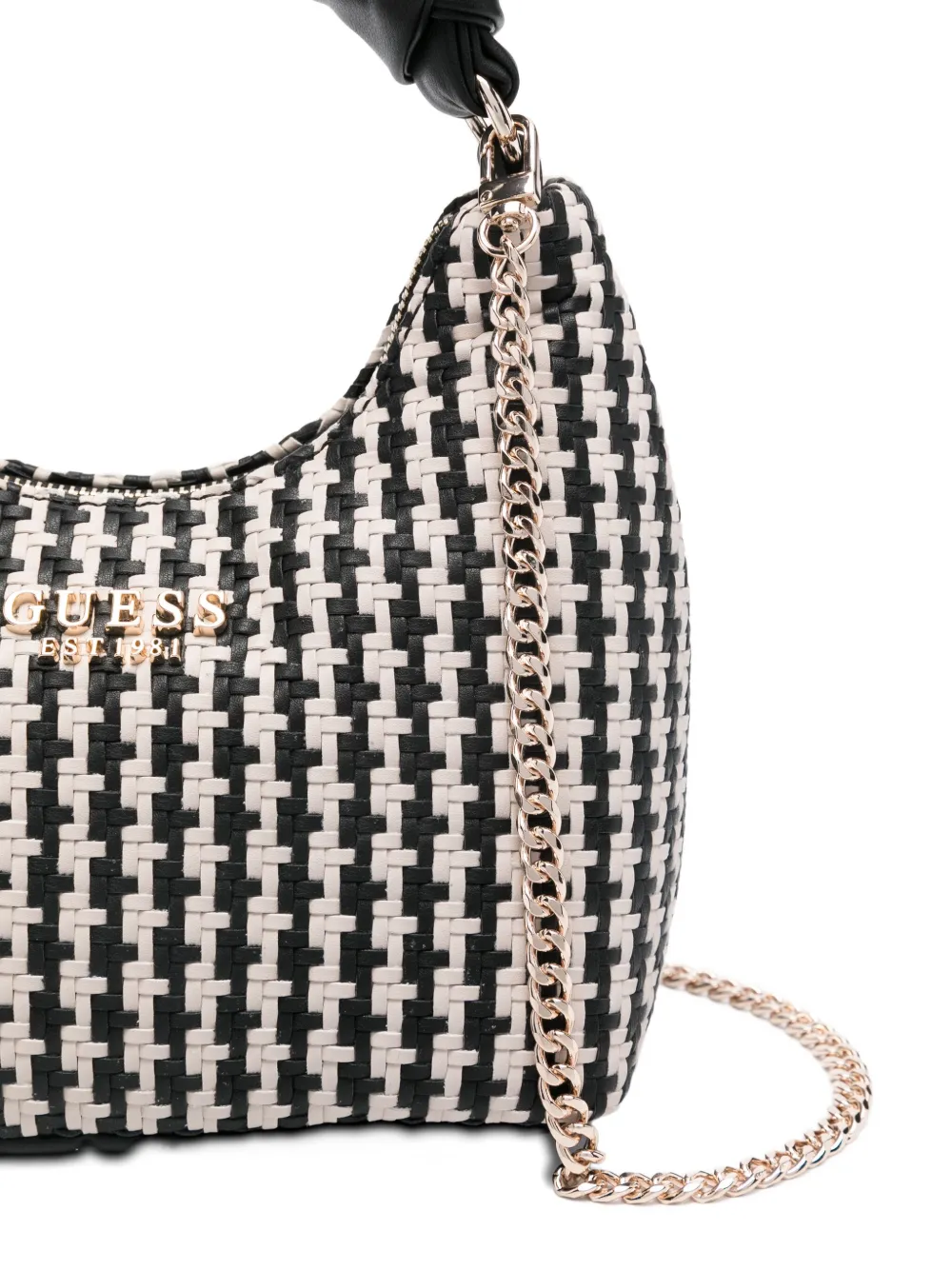 Черная плетеная текстура, завязанная сверху ручка, застежка-молния, ремешок-цепочка