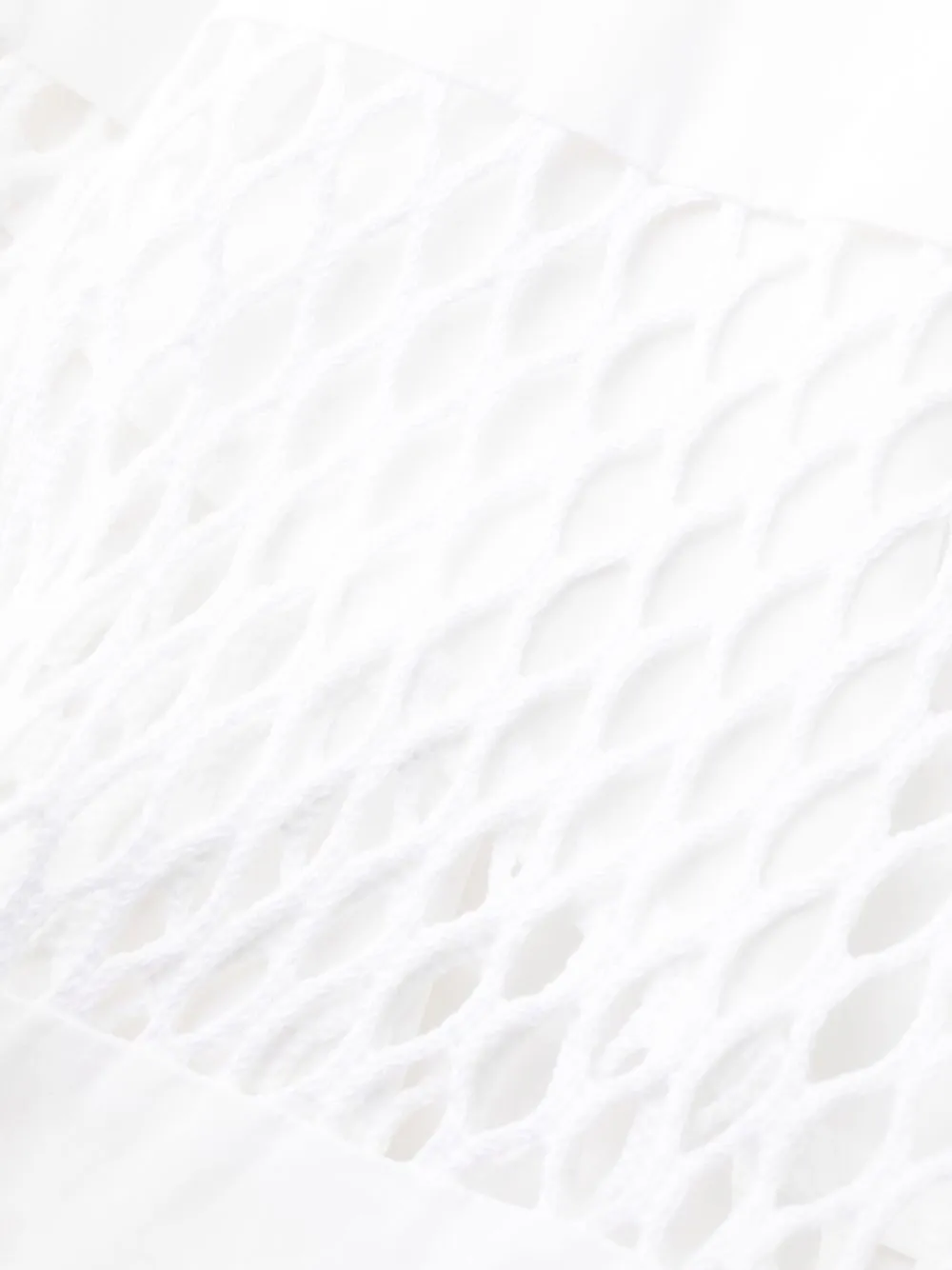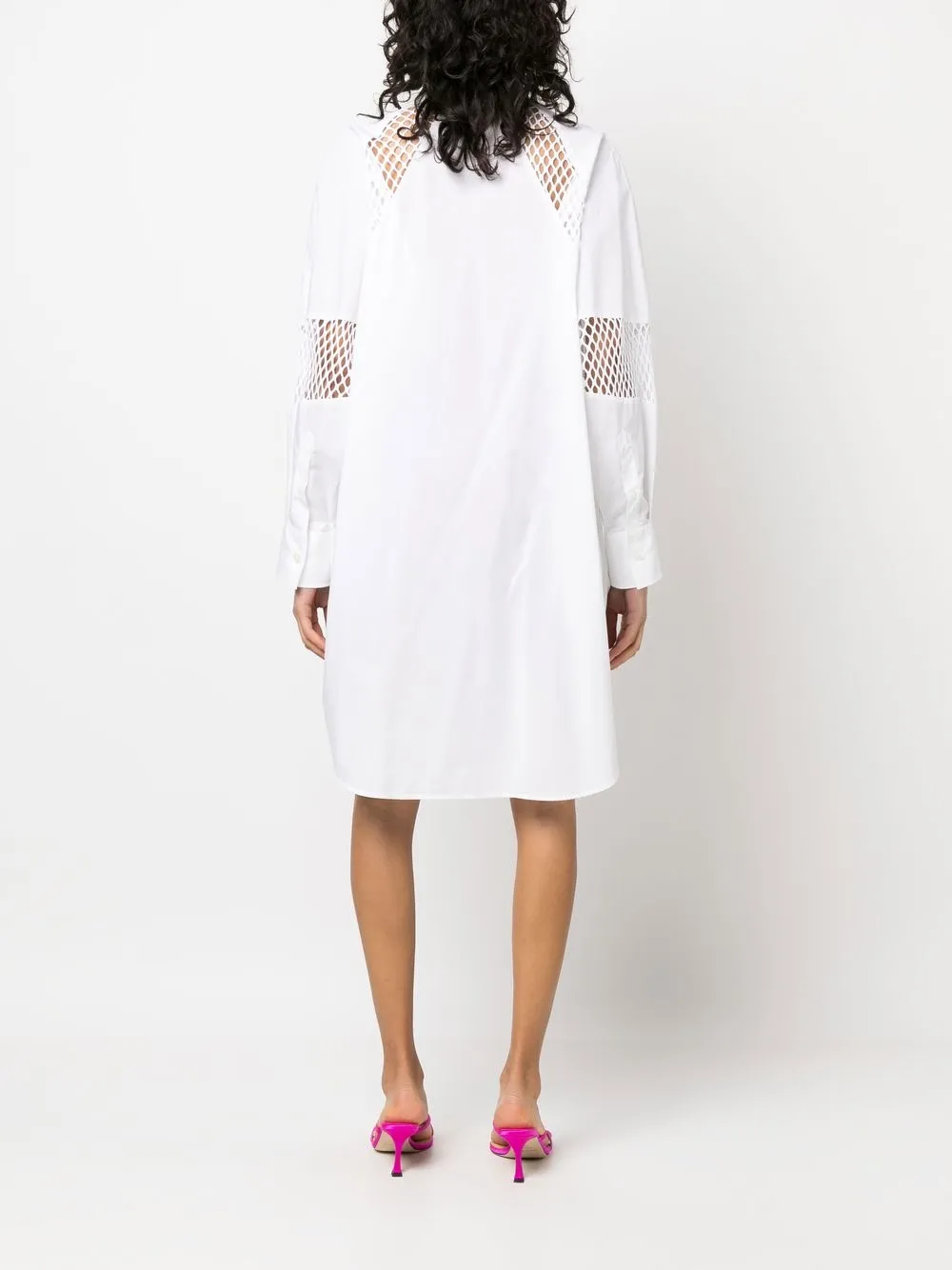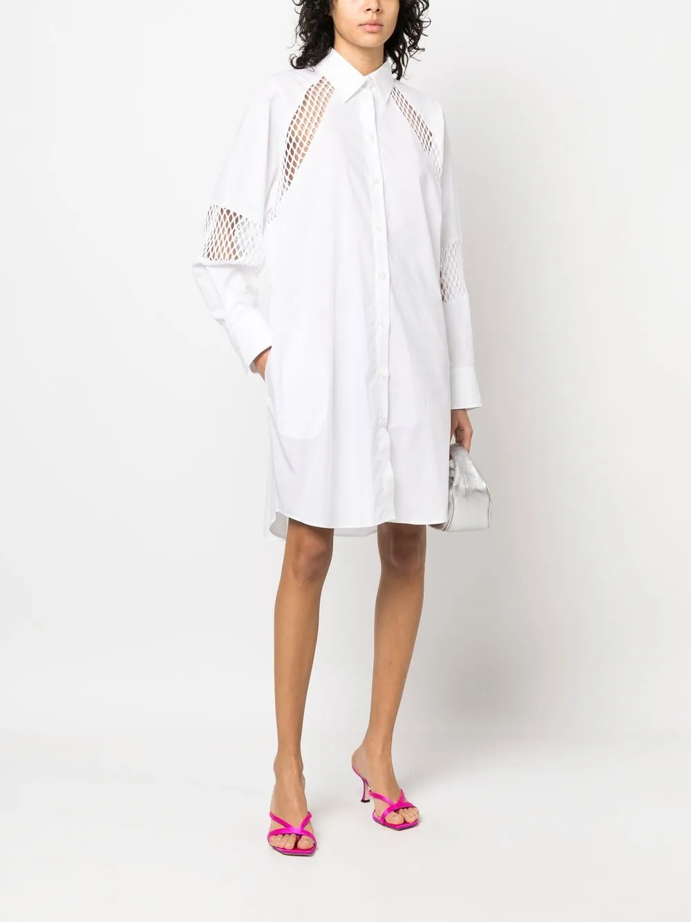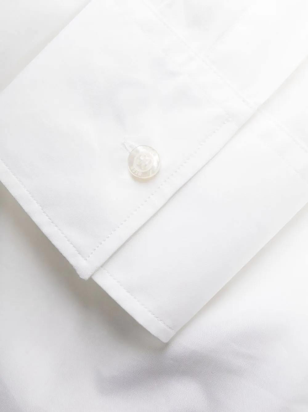 Белый, хлопок, классический воротник, застежка на пуговицах спереди, длинные рукава, манжеты на пуговицах и закругленный подол сзади.