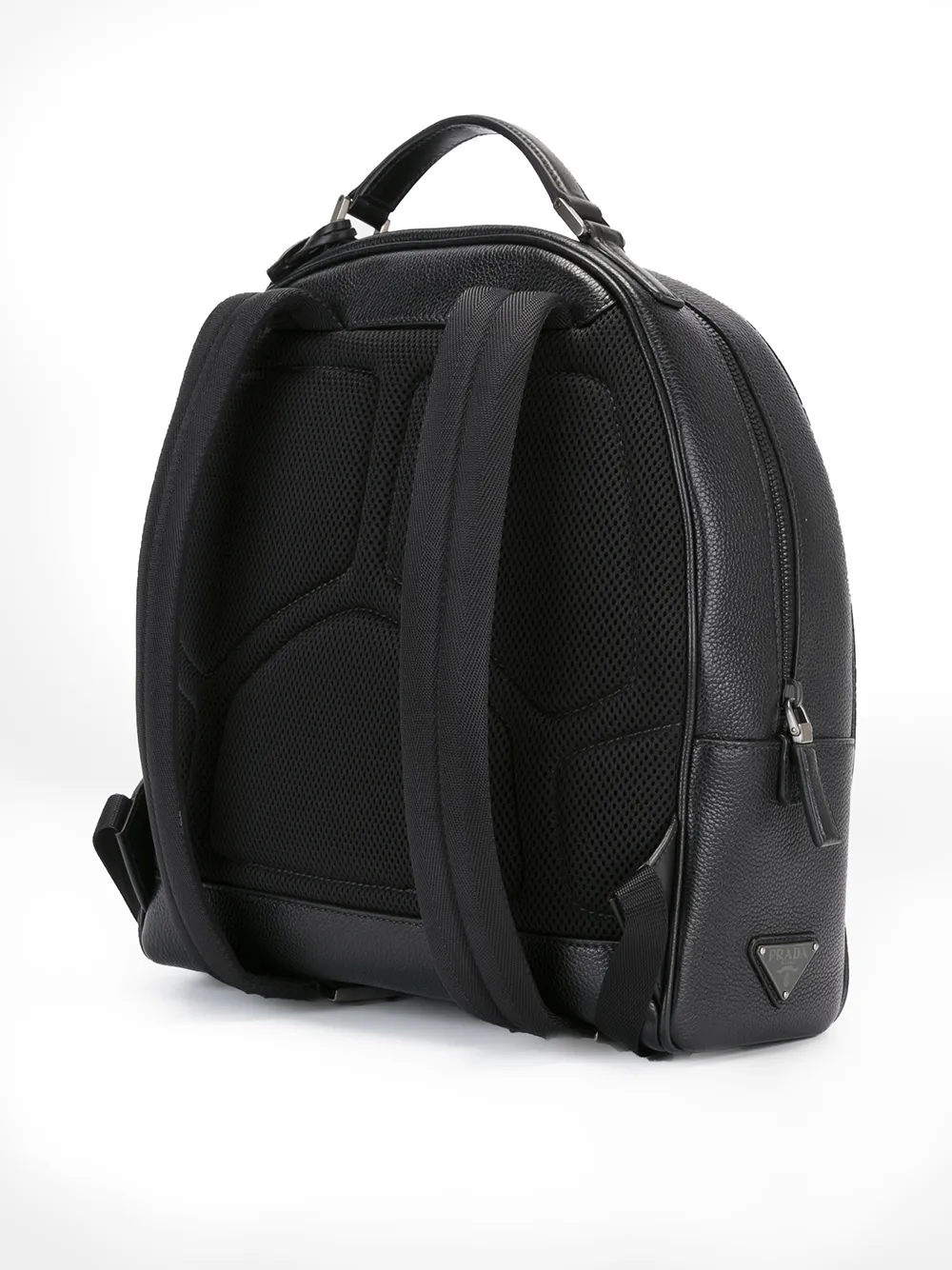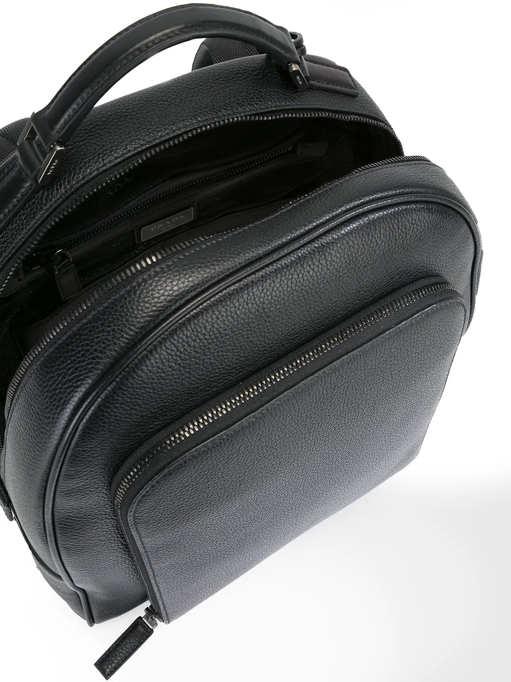 Черный кожаный рюкзак в минималистическом стиле от Prada. Внутренние карманы на молнии, передний карман на молнии, закругленная ручка, кожаный ярлык, тисненый логотип.