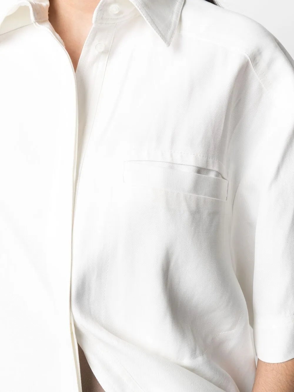 Классический воротник, планка на пуговицах спереди, короткие рукава и закругленный подол. Цвет: белый.