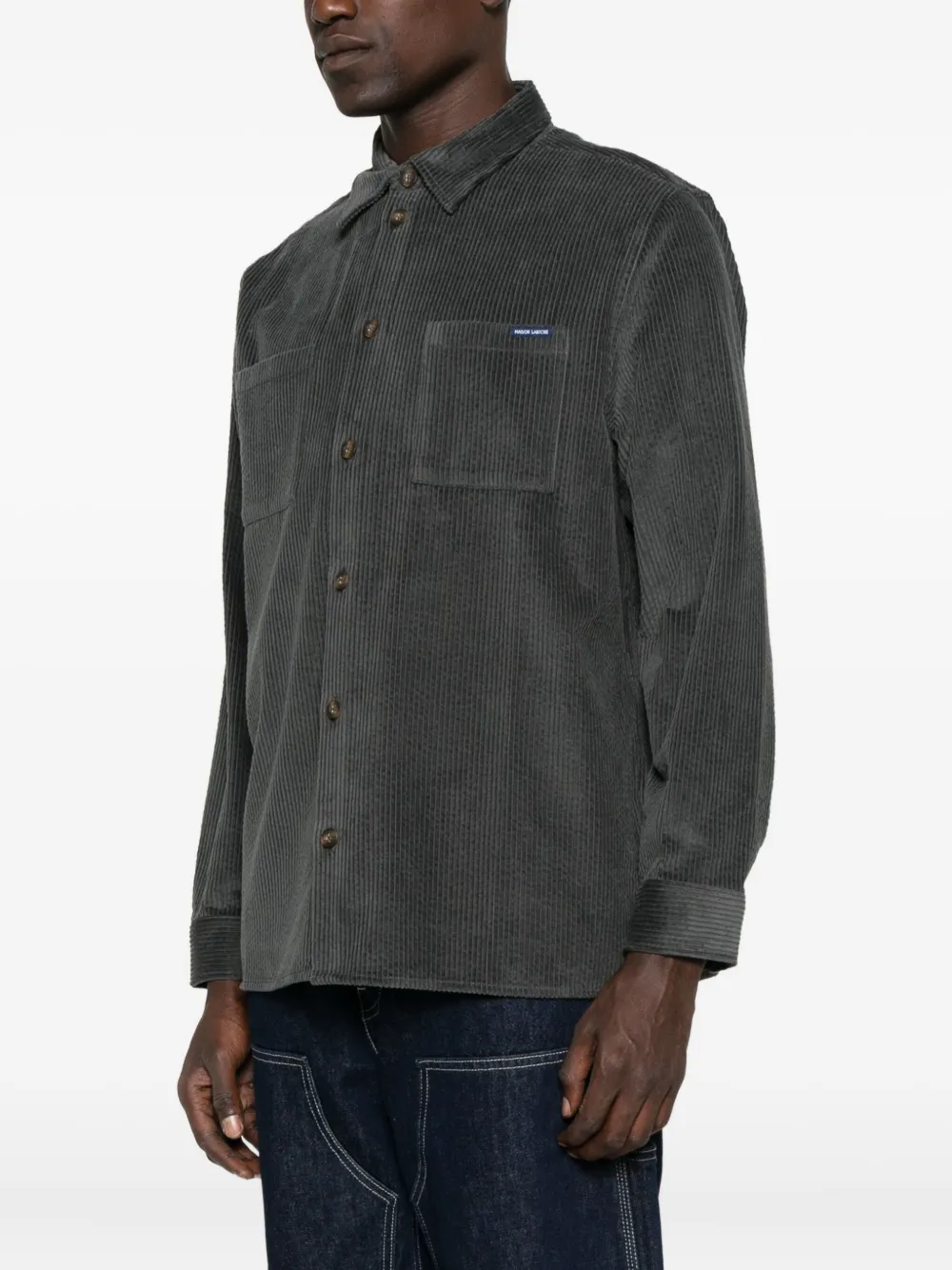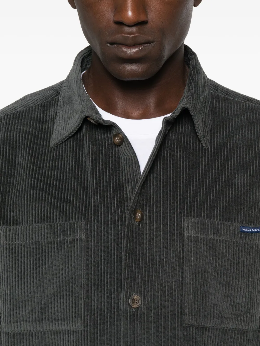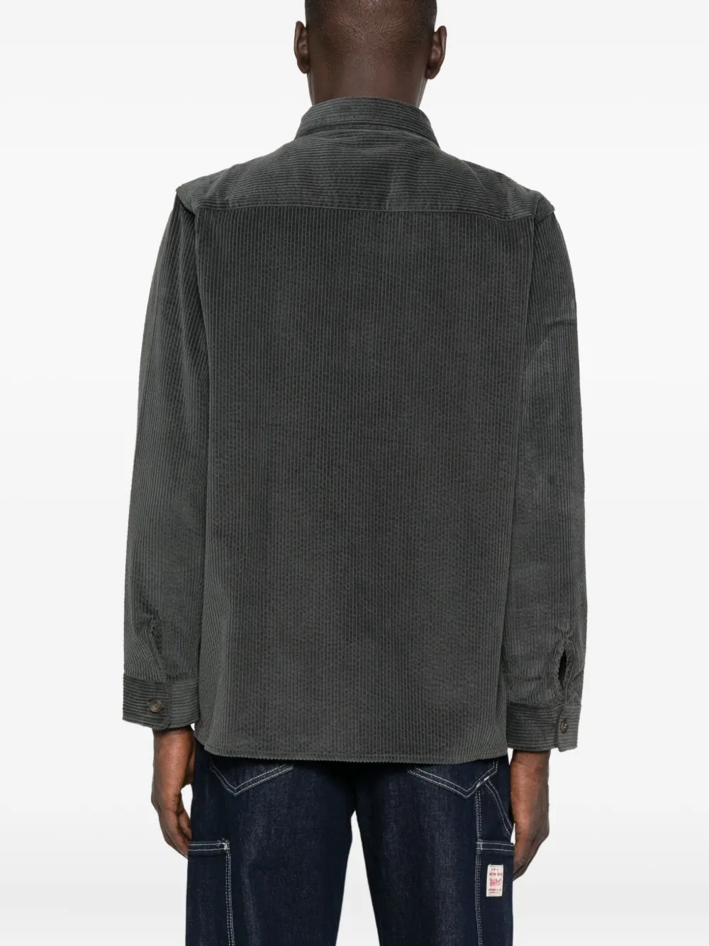 Темно-серая вельветовая текстура, застежка на пуговицы, длинные рукава, два накладных кармана, воротник-стойка.