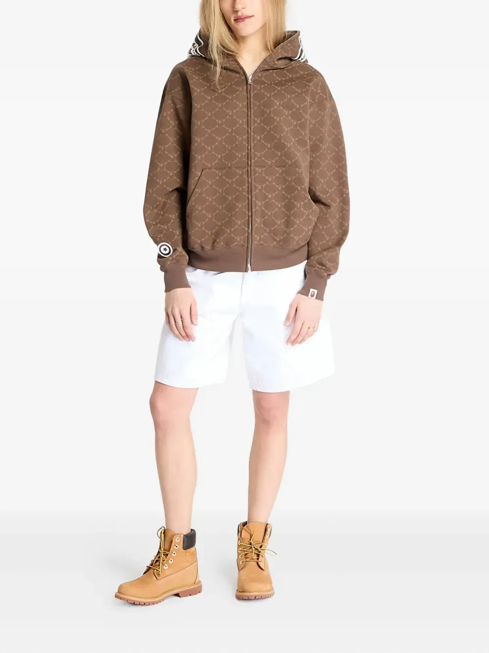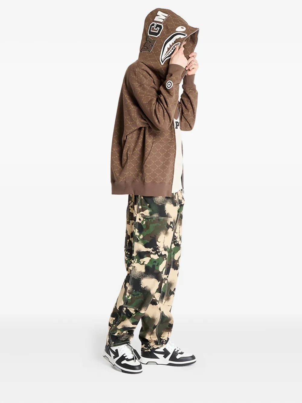 Коричневый узор с монограммой, застежка-молния по всей длине, капюшон с акульим принтом, ребристые манжеты, карманы-кенгуру
