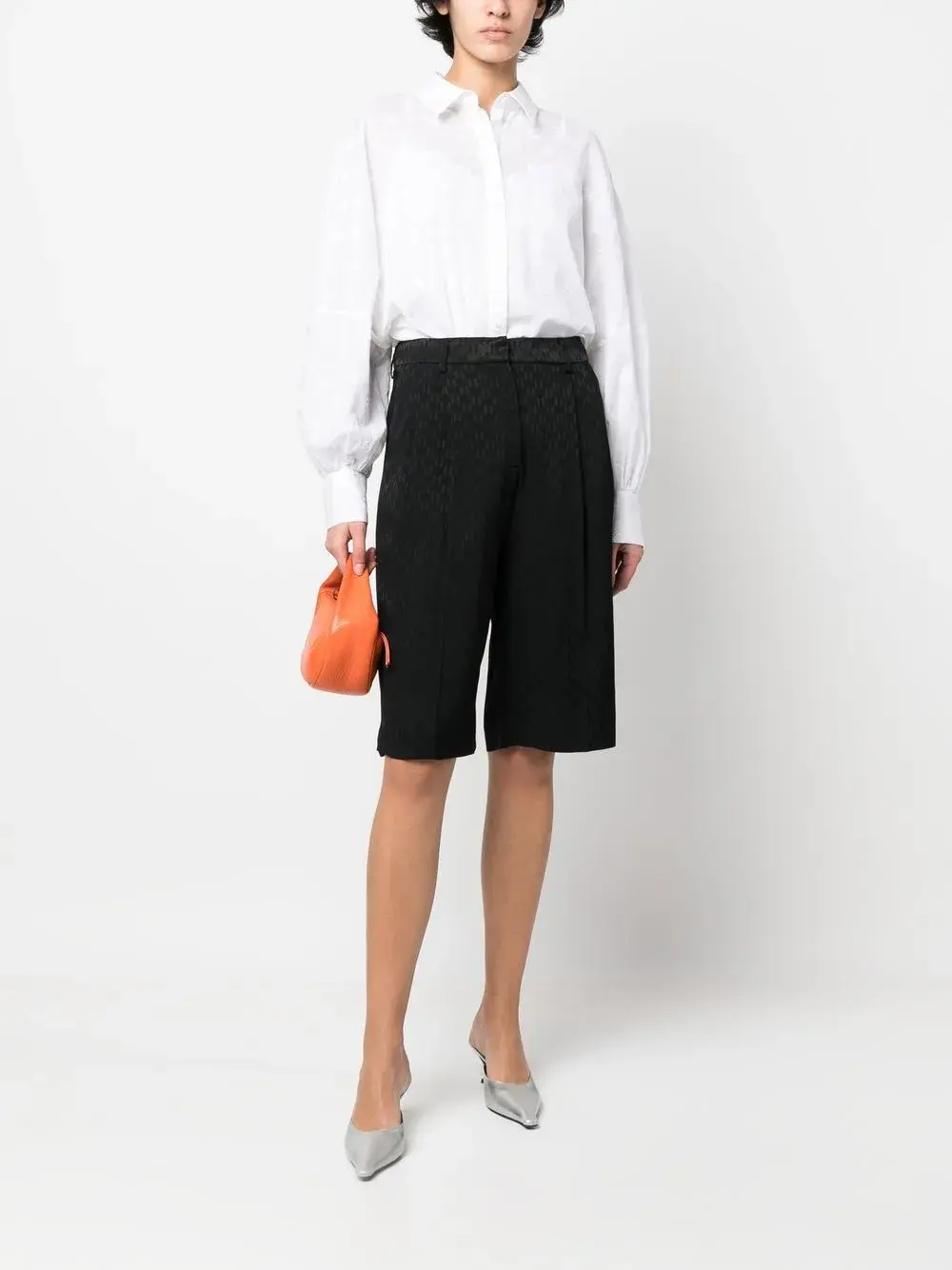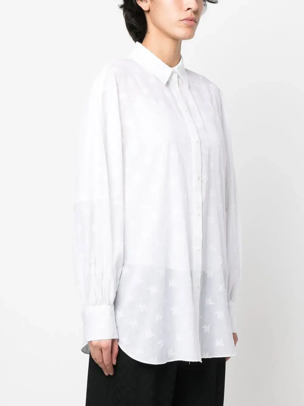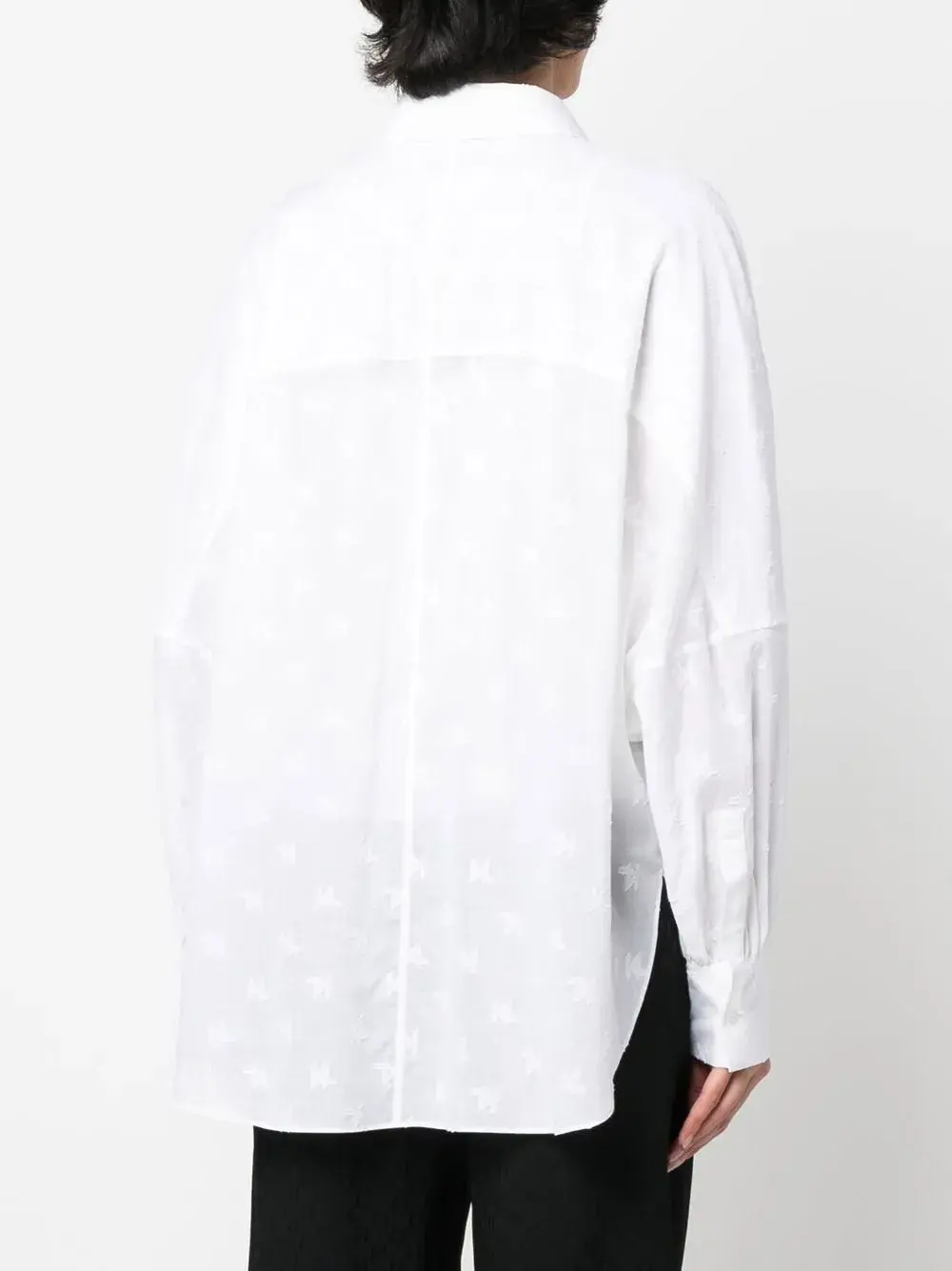 Белый, хлопок, узор с изображением монограммы, классический воротник, застежка на пуговицах спереди, длинные рукава, манжеты на пуговицах и закругленный подол.