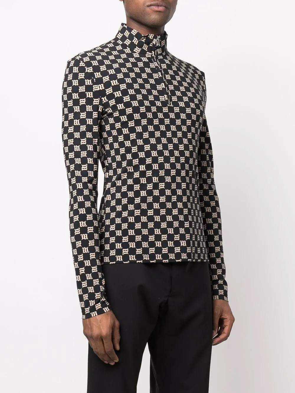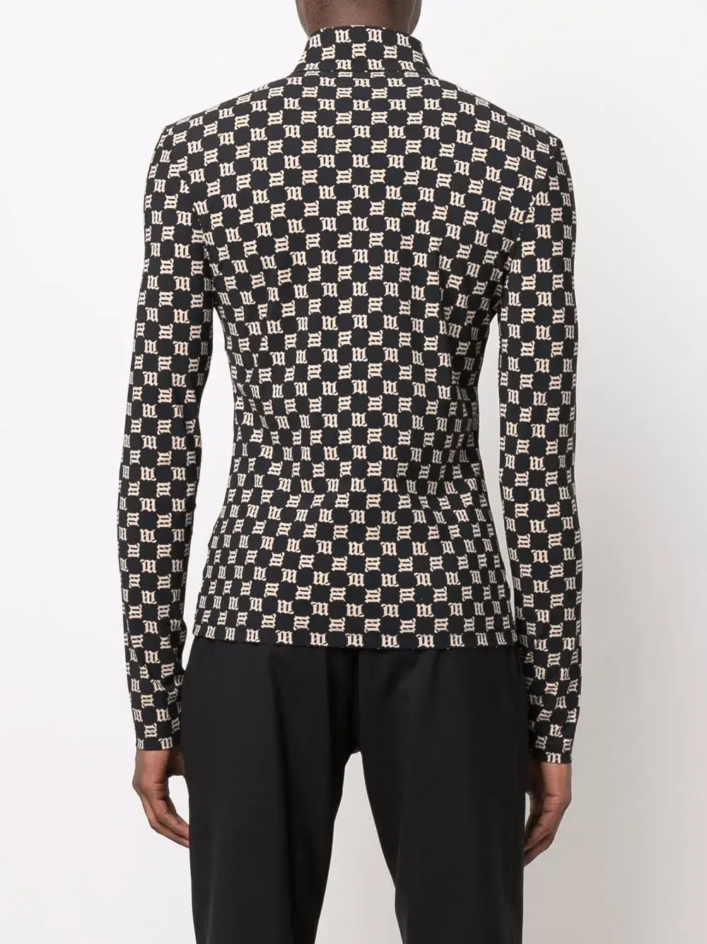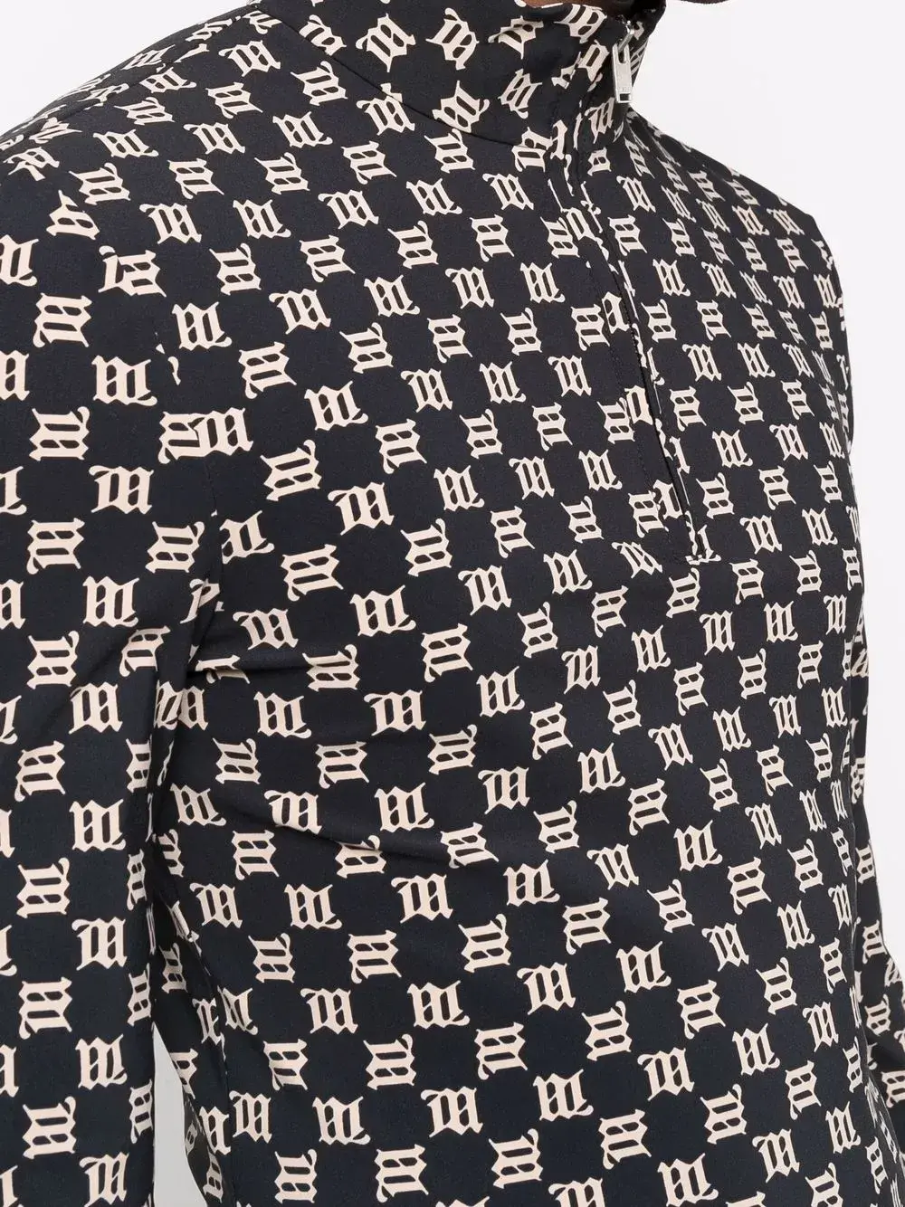 Узор с изображением монограммы, воротник-стойка, короткая застежка на молнии спереди, длинные рукава и прямой подол.