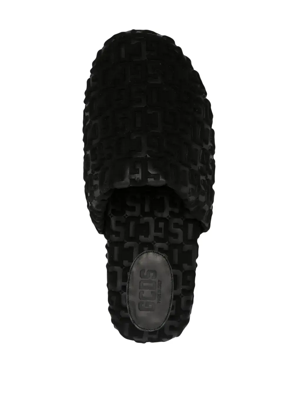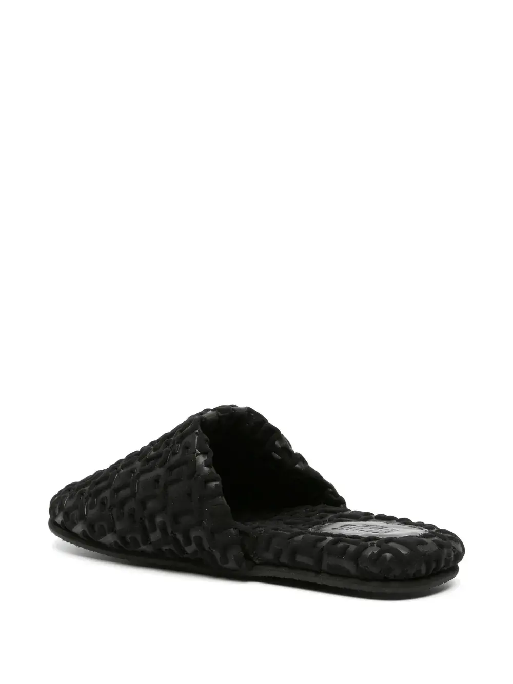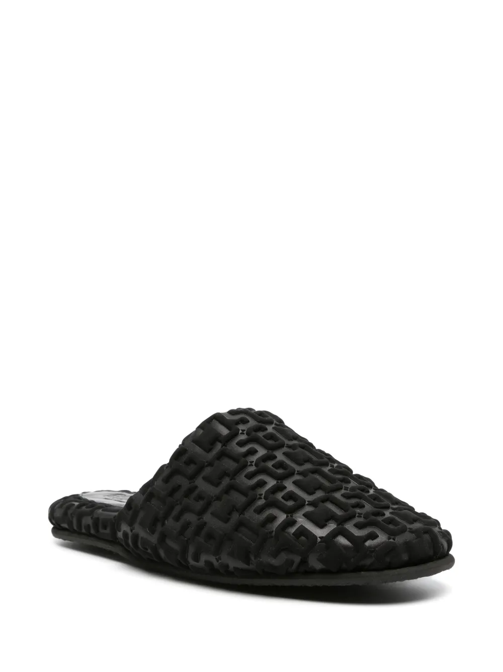 Черный, сплошной принт с логотипом, тисненый узор с монограммой, закругленный носок, модель без застежки, стелька с логотипом и плоская резиновая подошва.