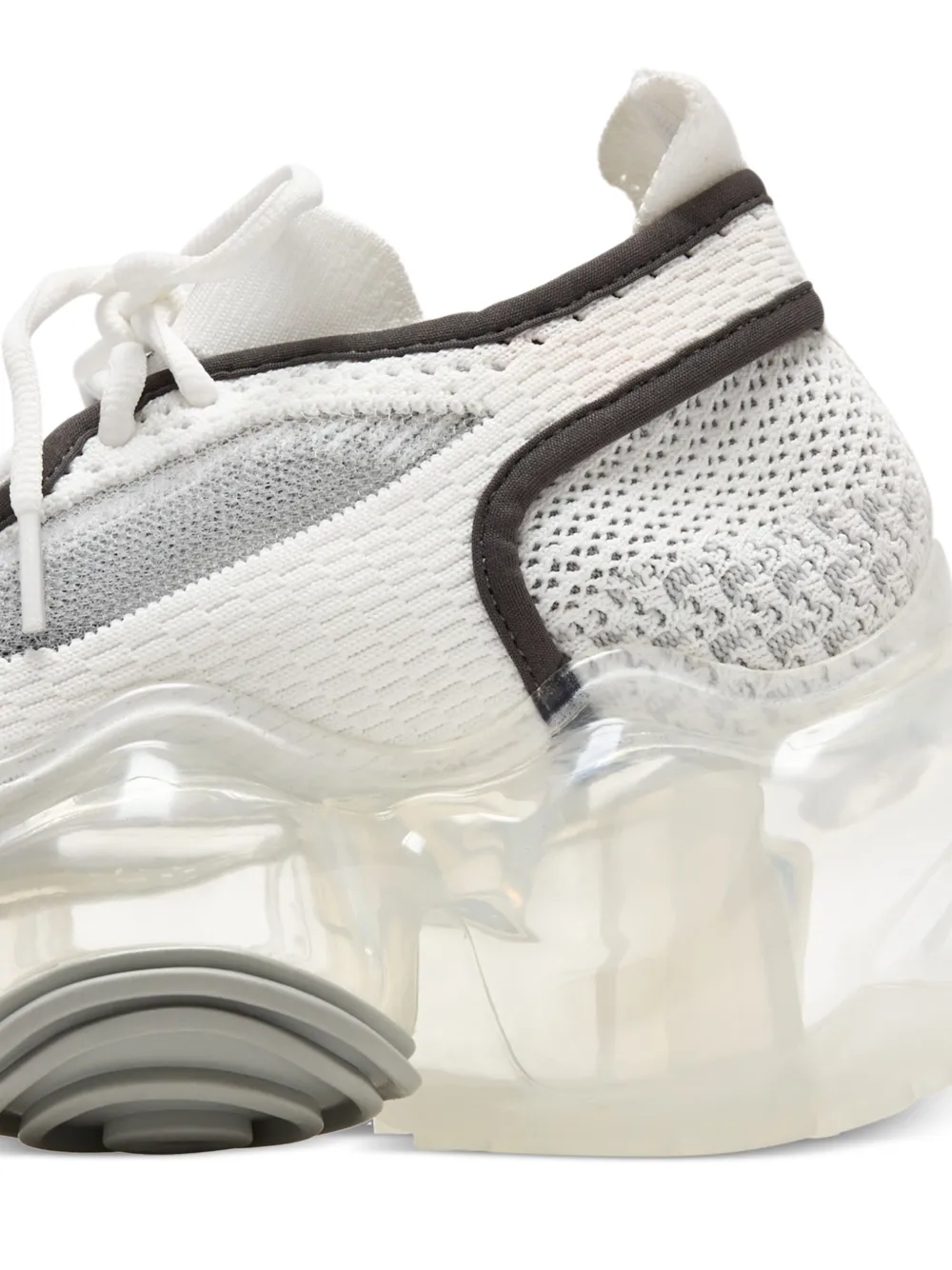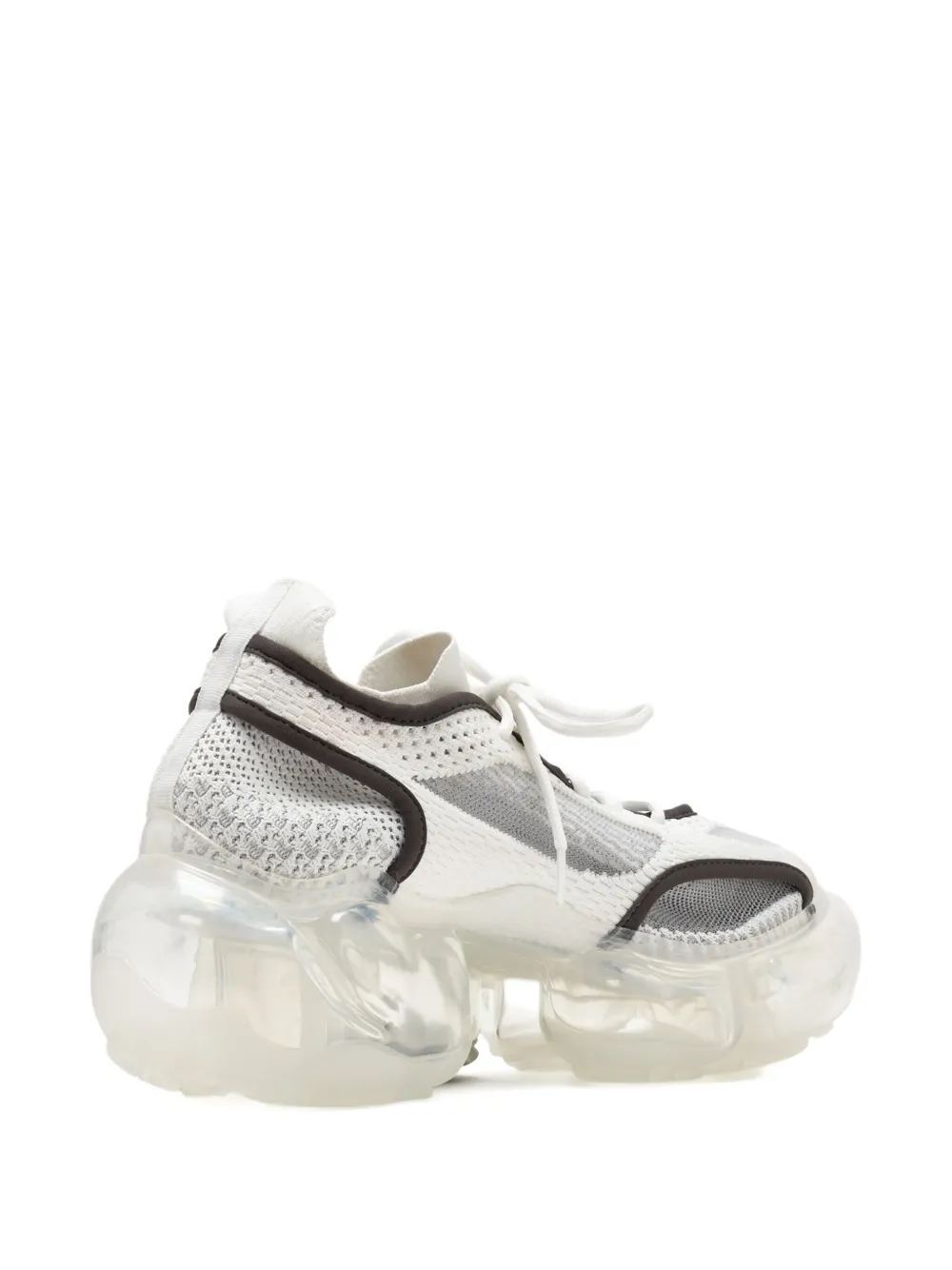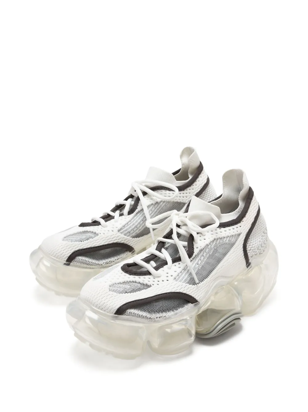 Белый трикотажный верх со шнуровкой и прозрачной пузырчатой подошвой.