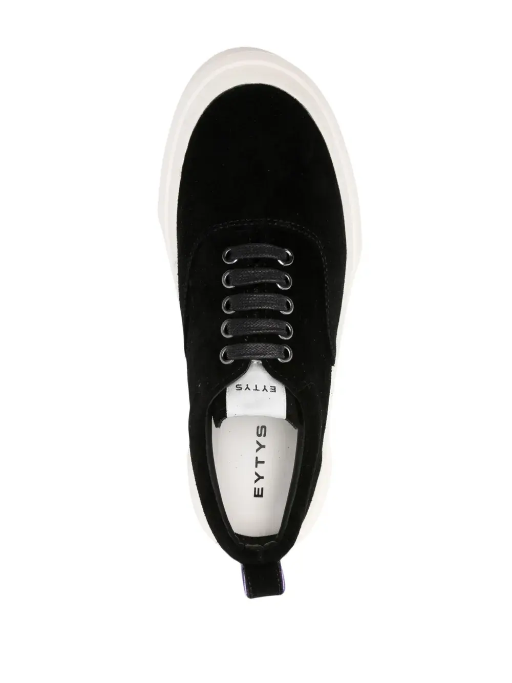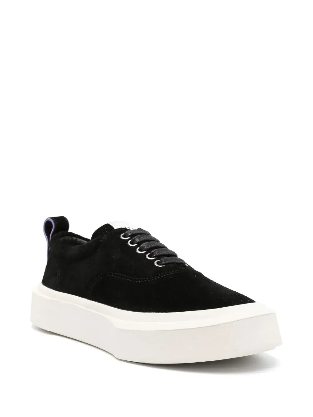 Черный, телячья кожа, замша из телячьей кожи, нашивка с логотипом на язычке, тисненый логотип сзади, шнуровка спереди, подошва на платформе, петля для подтягивания сзади, стелька с логотипом и плоская резиновая подошва.