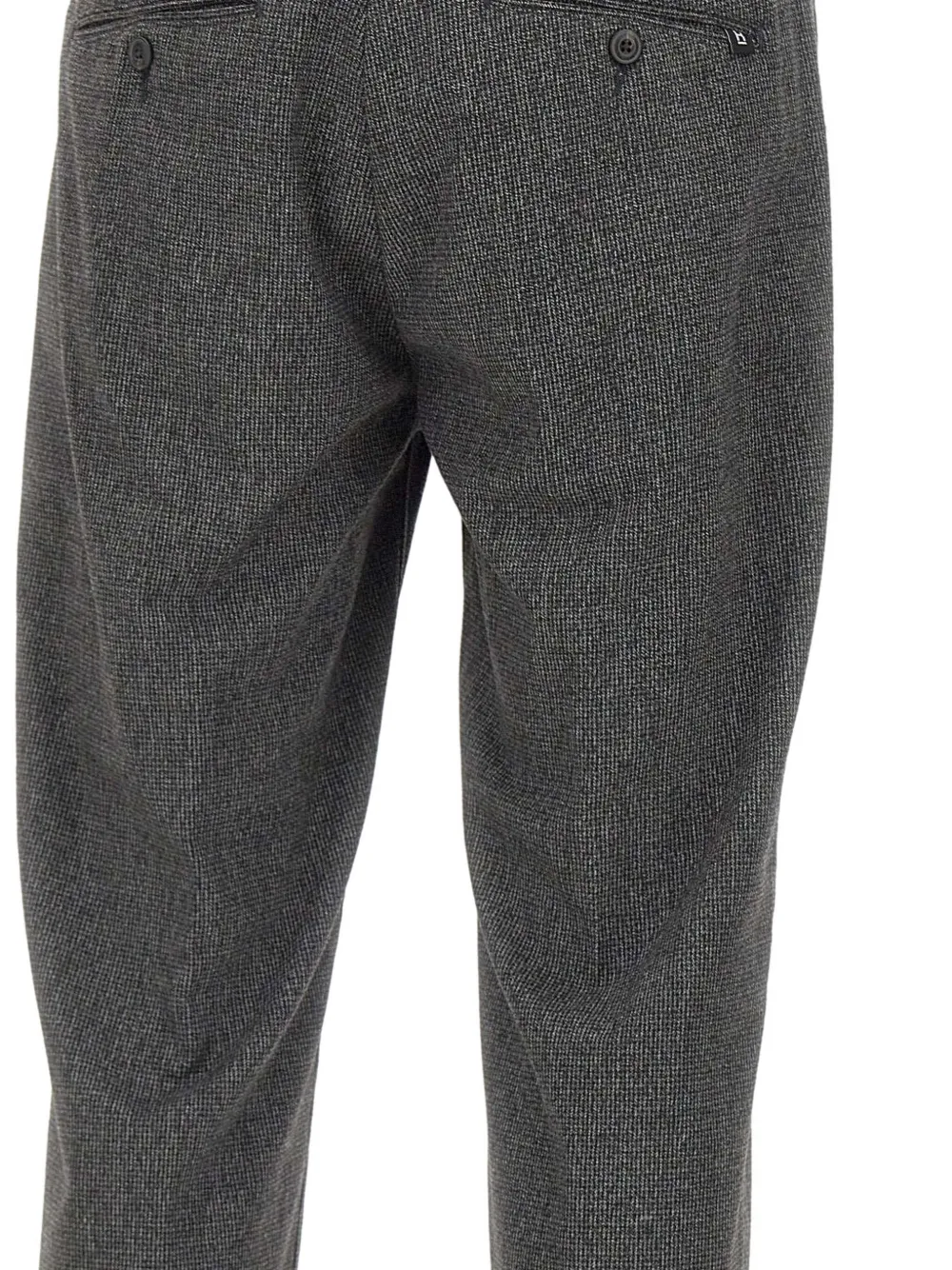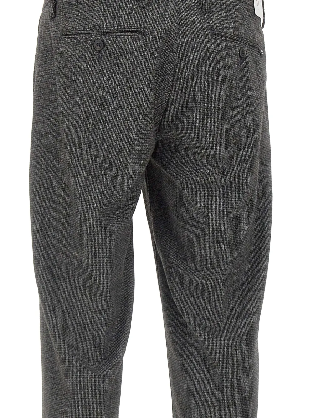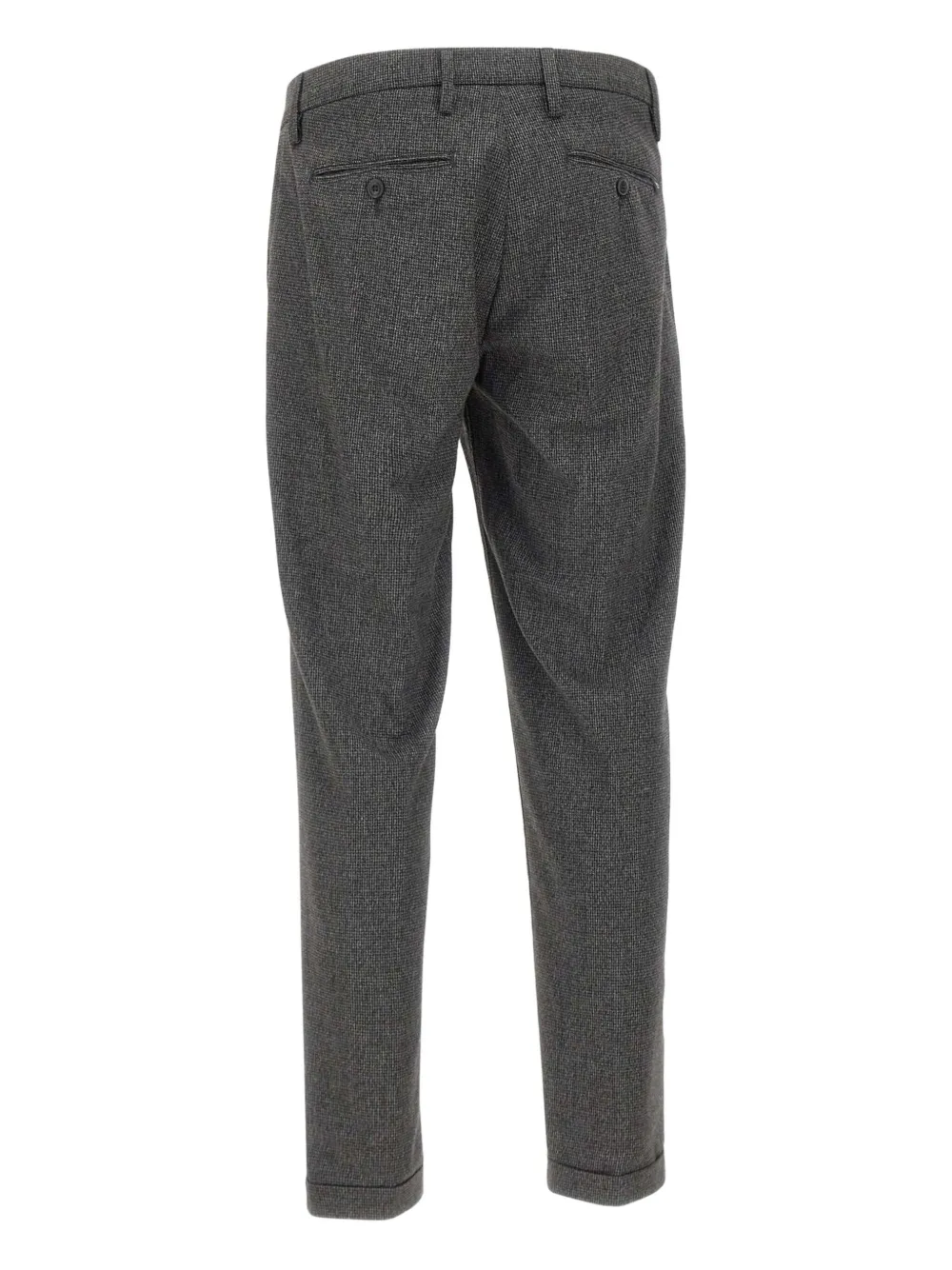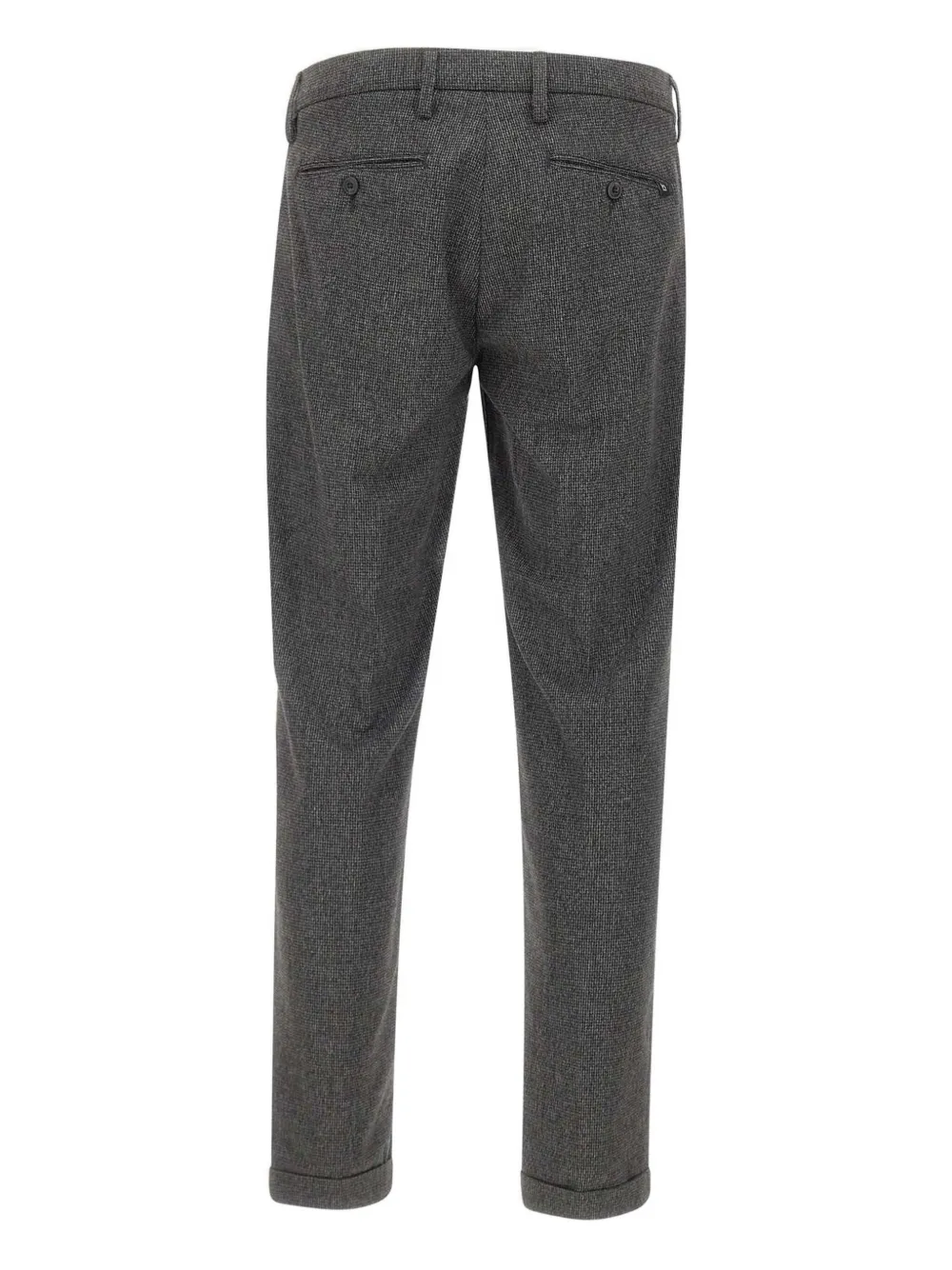 Темно-серый микроузор спереди, застежка на пуговицы, манжеты, нижние края, прямые штанины, шлевки для ремня.