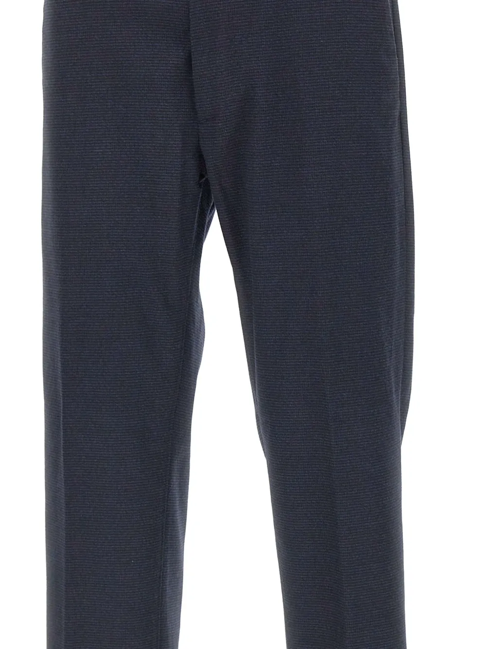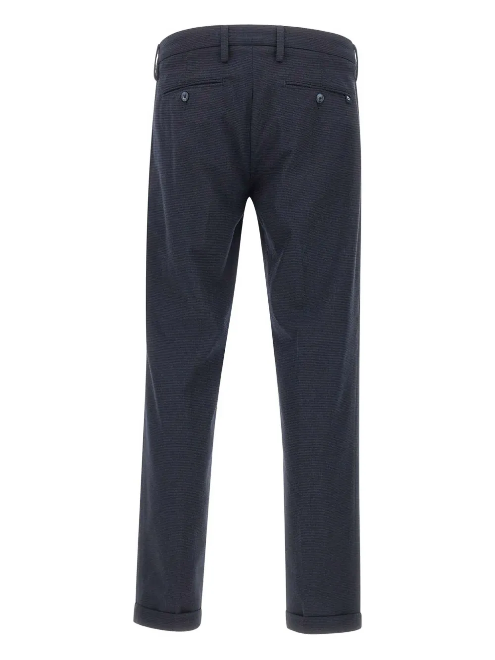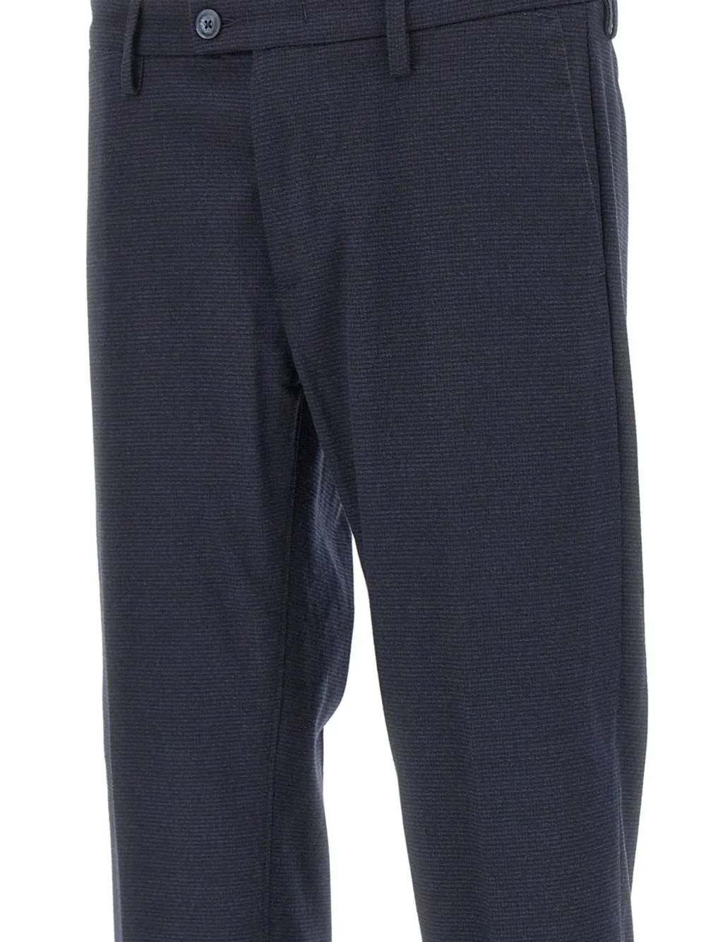 Темно-серый микроузор спереди, застежка на пуговицы, манжеты по низу, прямые штанины, два кармана сзади.