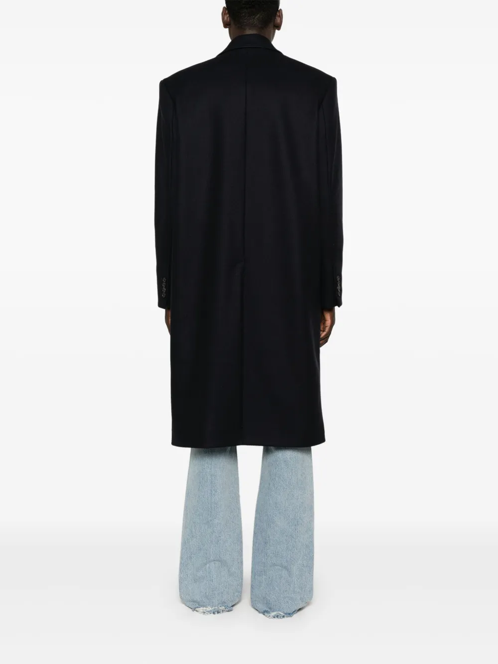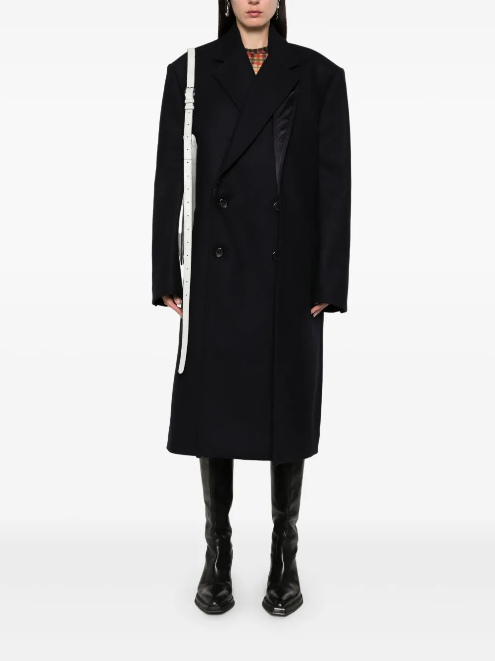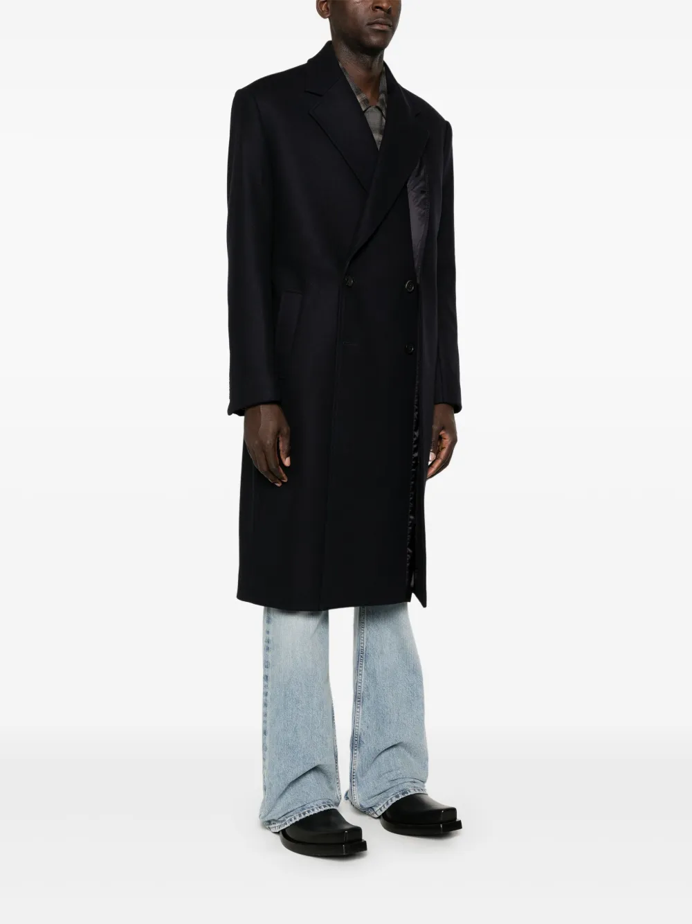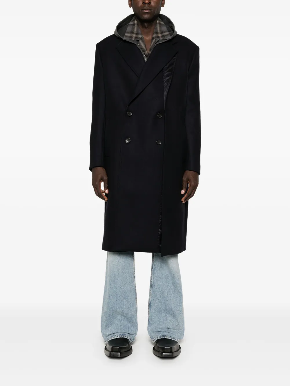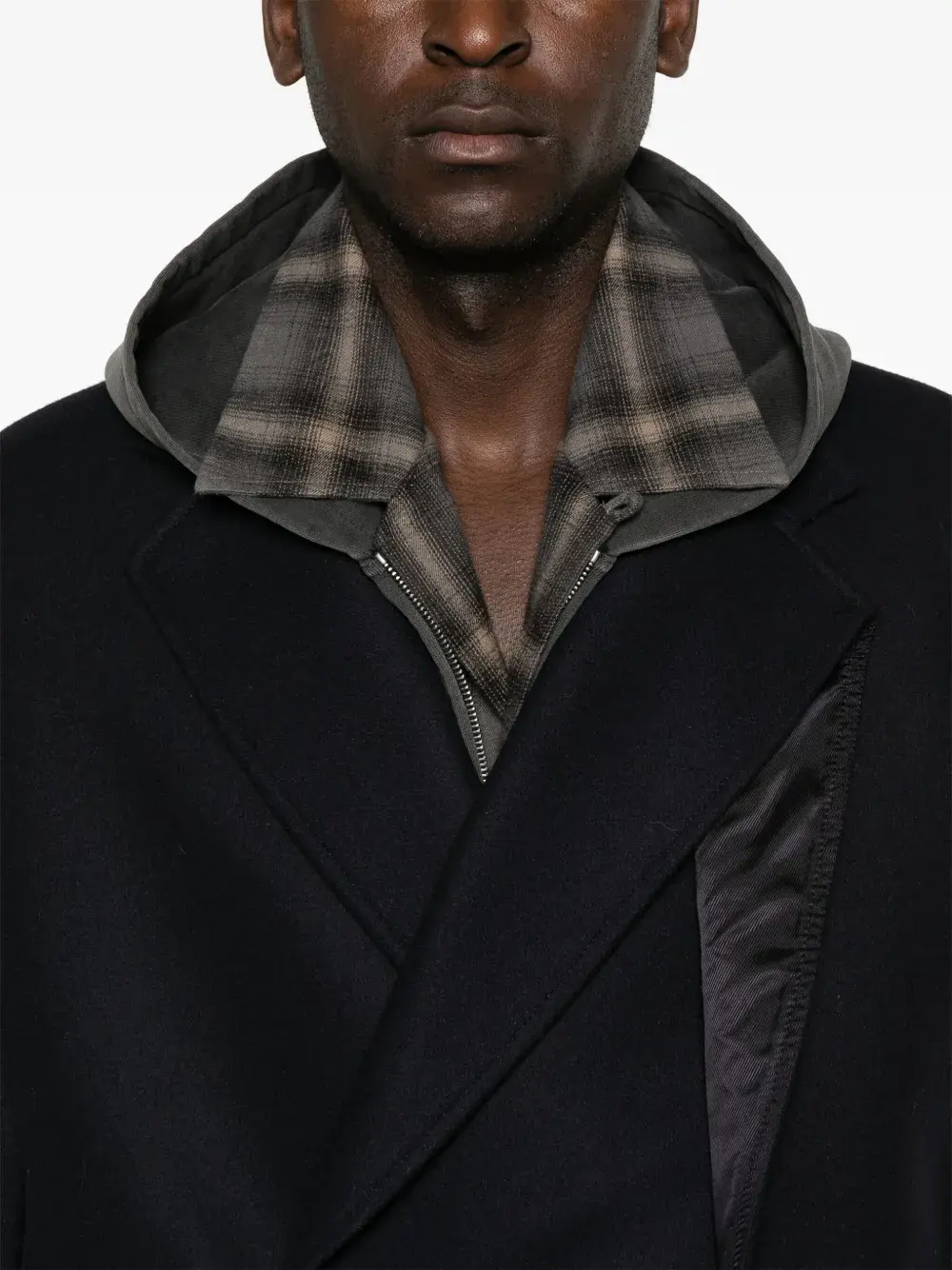 Подробнее о товаре: • темно-синий • смесовая шерсть • материал c флисовой текстурой • многослойный дизайн • двубортная застежка на пуговицы • зазубренные лацканы • длинные рукава • манжеты на пуговицах • два прорезных кармана сбоку • шлица по центру сзади • цельная подкладка • прямой подол • Это унисекс-модель. Обратите внимание, что для нее используется мужская размерная сетка.