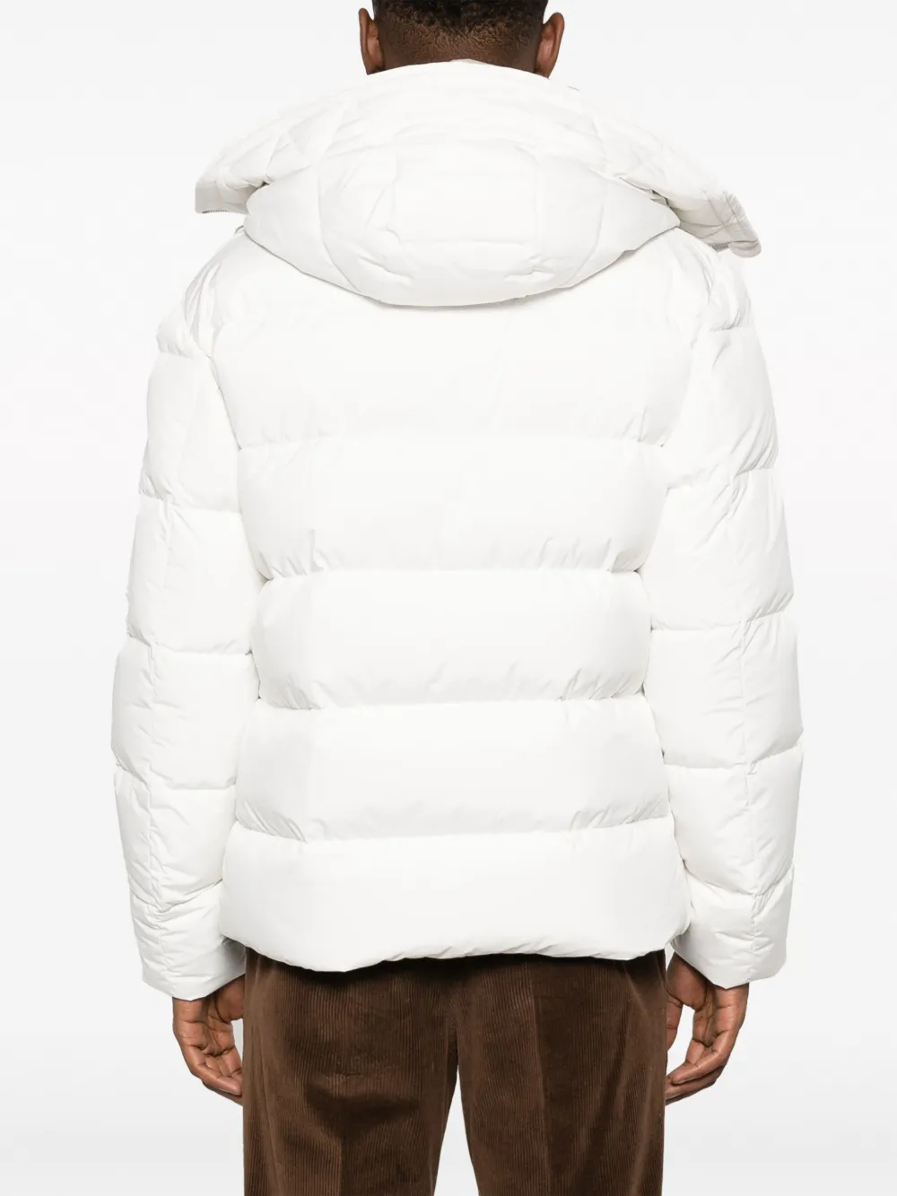 Белый, наполнитель из пуха и перьев, многослойный дизайн, дутый материал, классический капюшон, застежка на молнии спереди, длинные рукава, карман с молнией на рукаве, два прорезных кармана на пуговицах спереди и прямой подол.