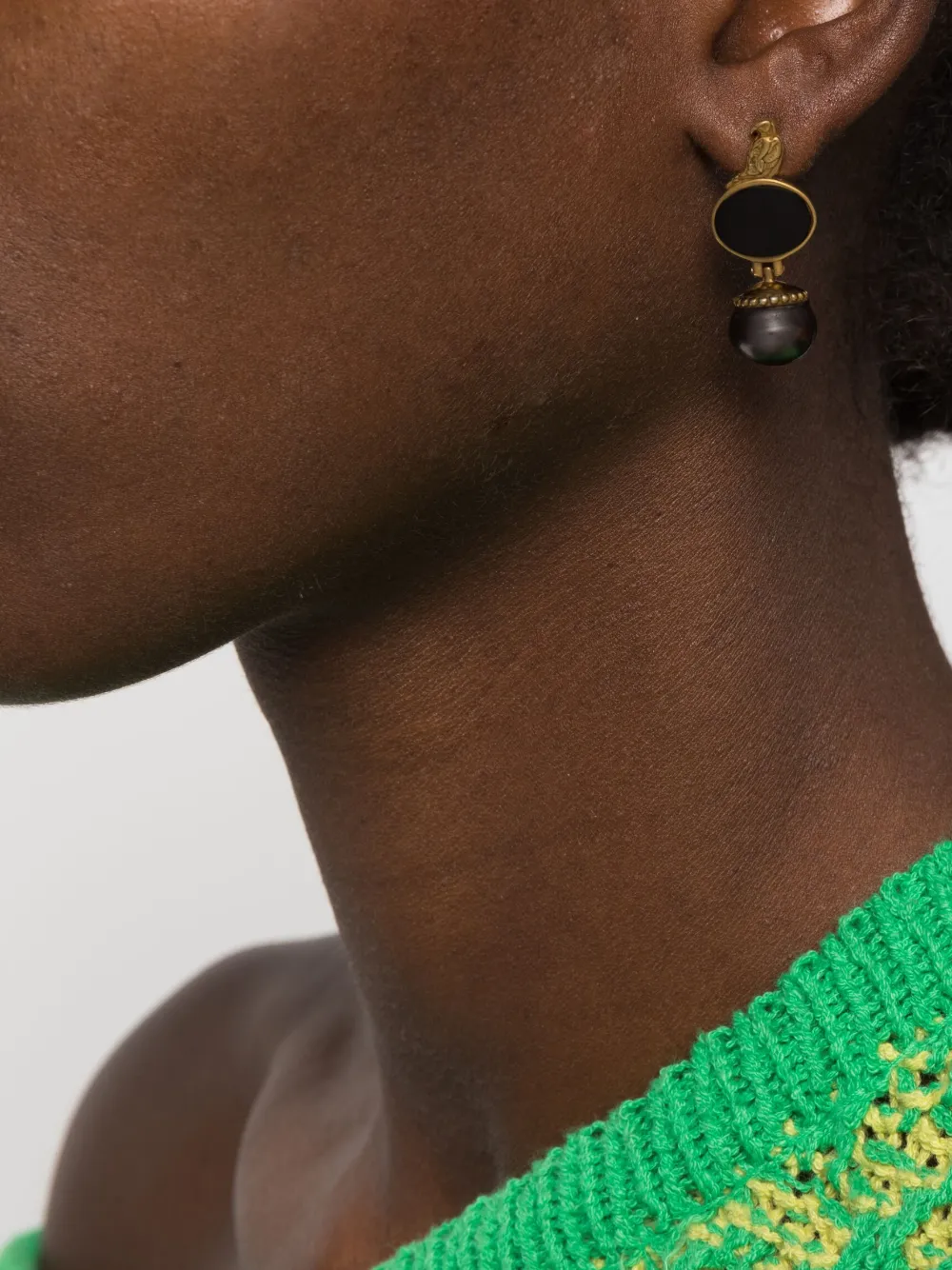 Глянцевая фактура, тисненая деталь, барочный жемчуг и застежка-штифт. В комплект входят две серьги.
