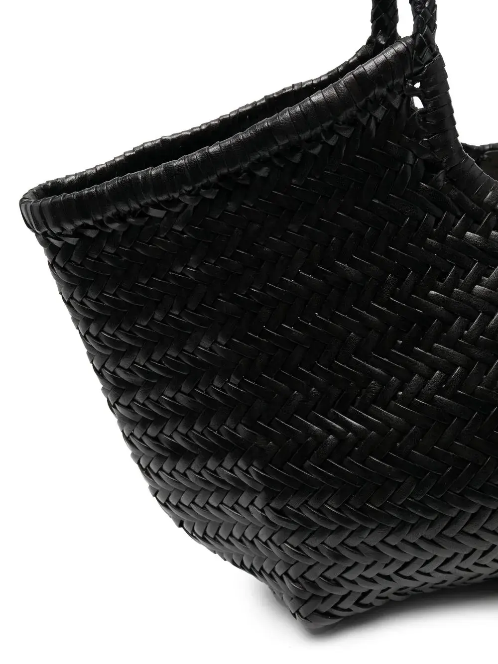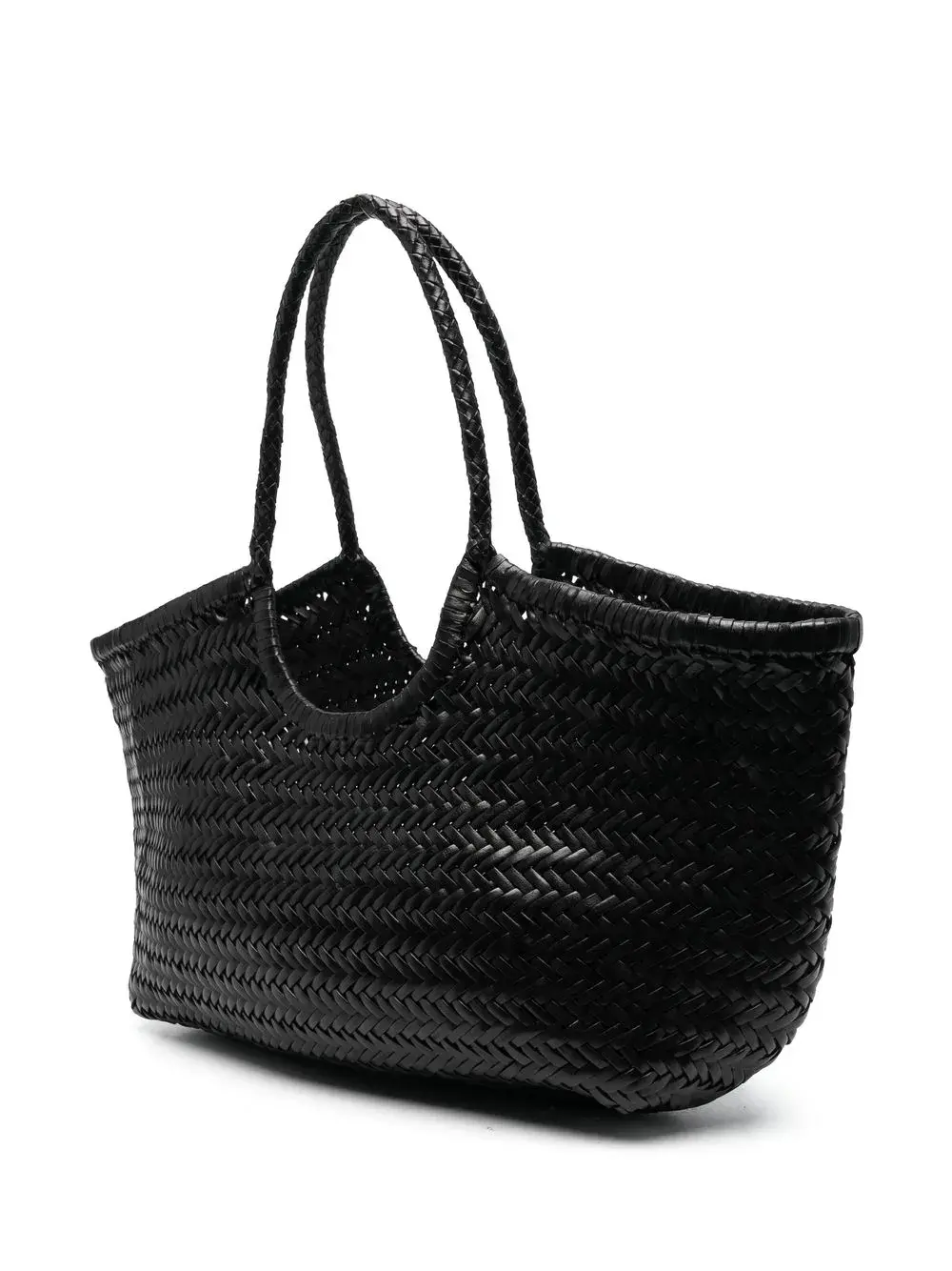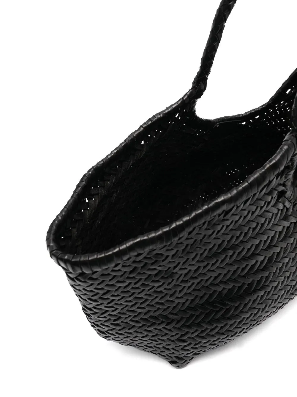 Черный, кожа, переплетенный дизайн, две закругленные ручки, основное отделение и дизайн с открытым верхом.