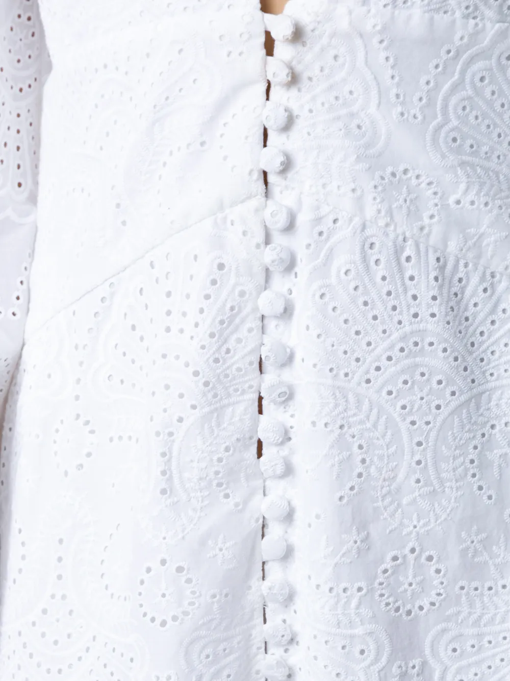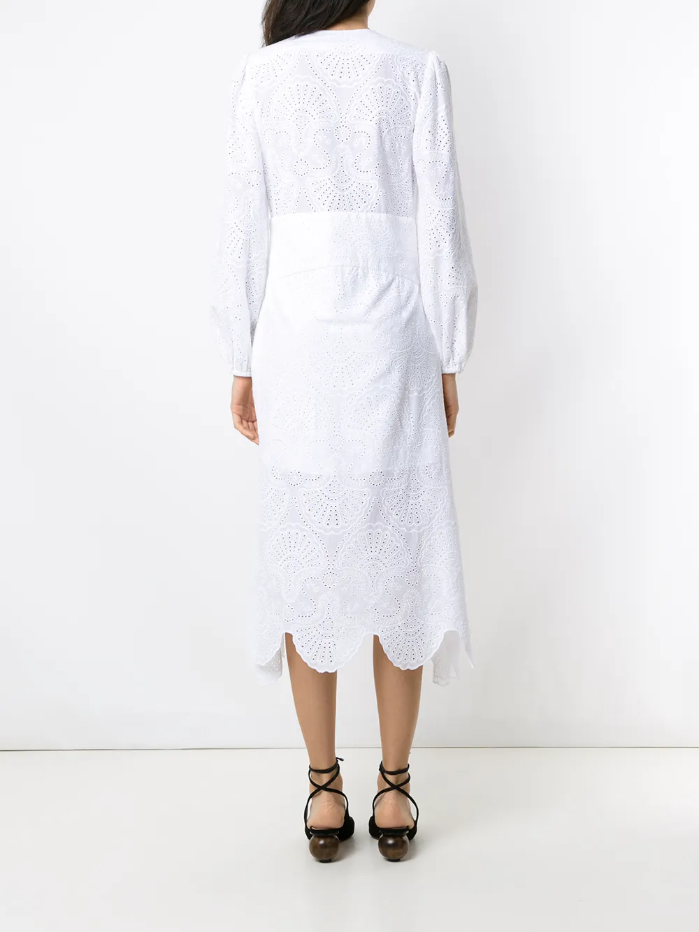 Бежевое платье Nielle с глубоким декольте от Olympiah изготовлено из хлопка. Модель имеет глубокий V-образный вырез, длинные рукава, перфорацию, застежку на пуговицах спереди и свободный крой.