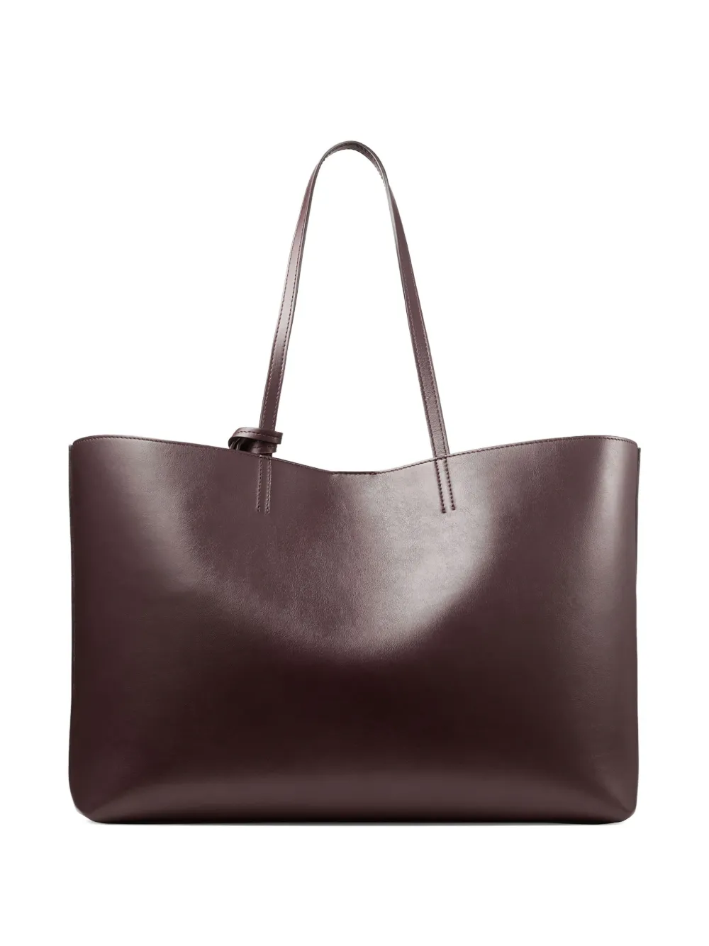 Телячья кожа темно-фиолетового цвета с золотистой пластинкой-логотипом, двойной ручкой сверху, внутренним карманом на молнии