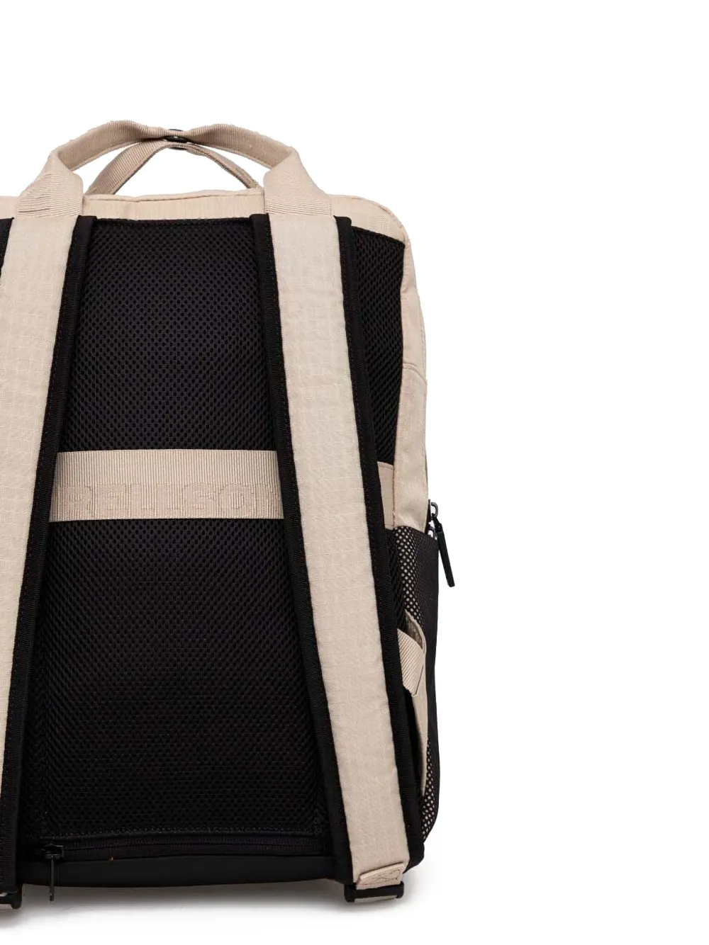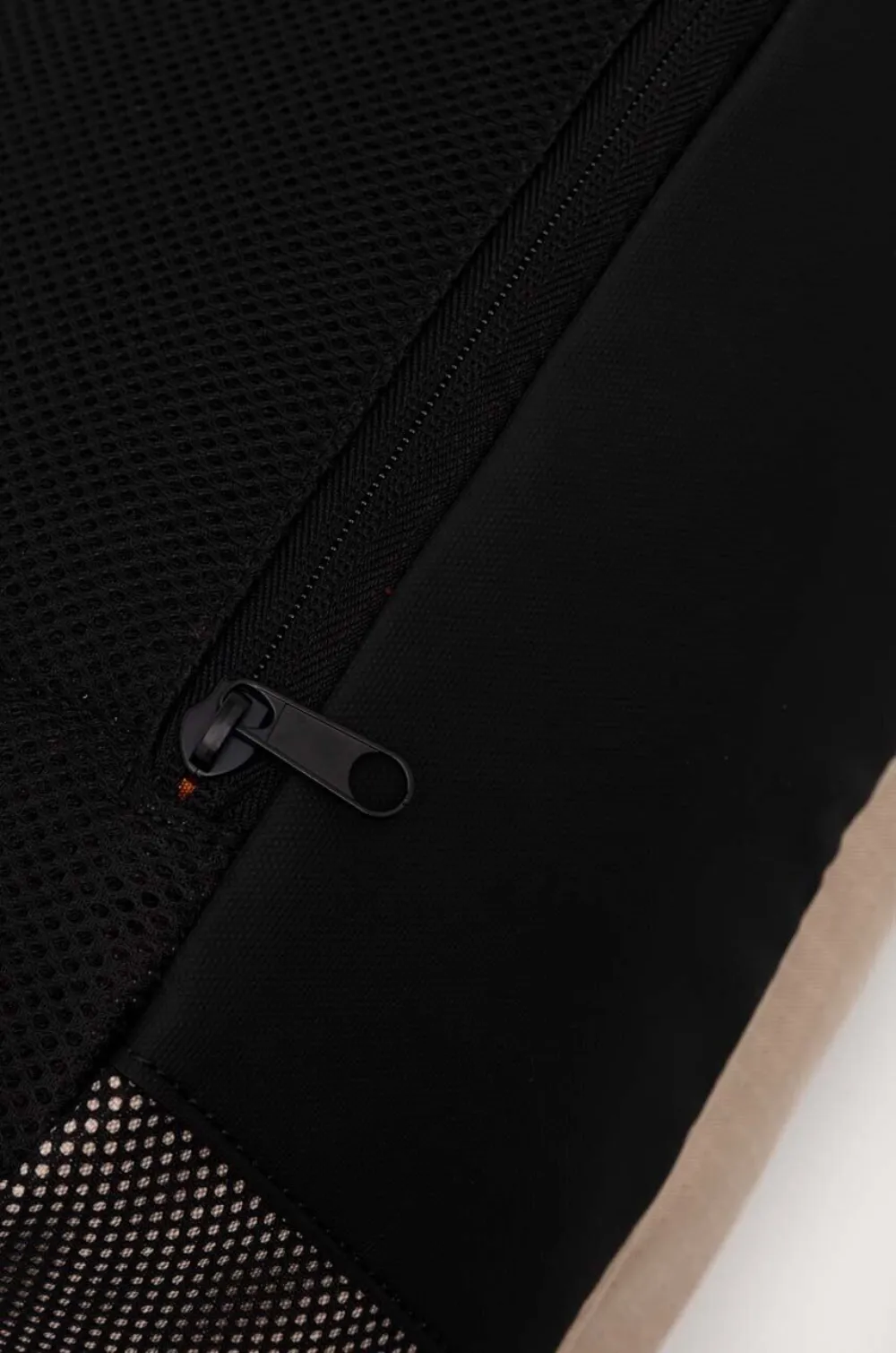 Бежевая черная сетчатая панель, верхняя ручка, застежка-молния, регулируемые плечевые ремни, внешний карман на молнии.