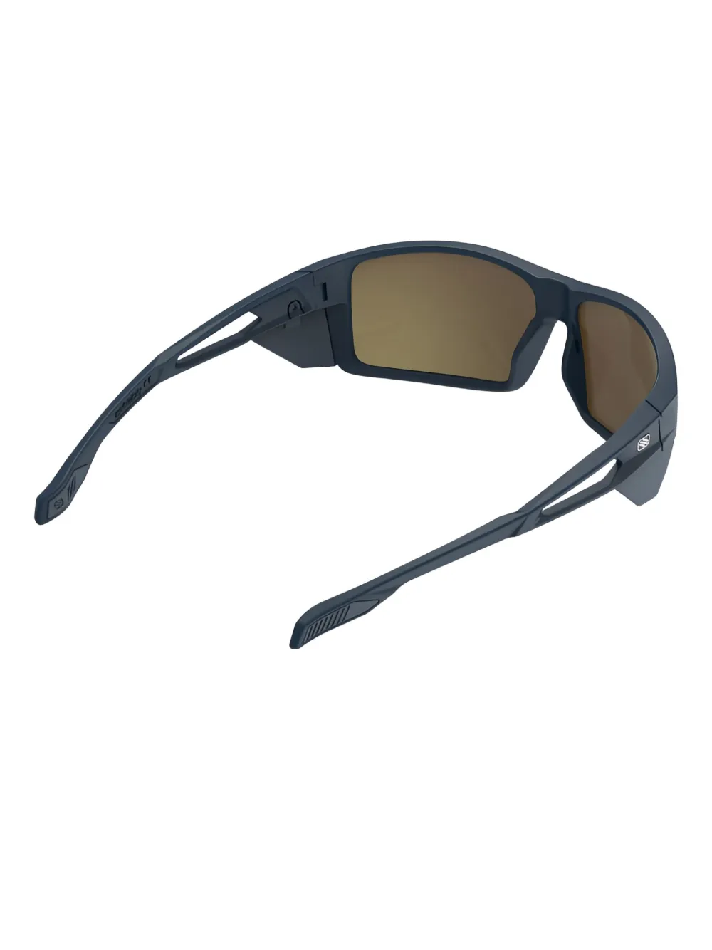 Синяя байкерская оправа, зеркальные линзы, матовые боковые щитки. Очки поставляются с защитным футляром.