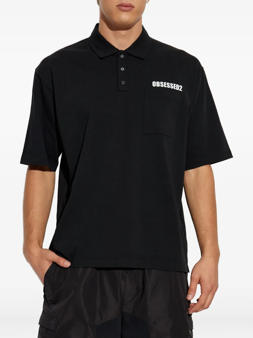Черная хлопковая модель с короткими рукавами, планкой на трех пуговицах, накладным карманом и принтом Obessed2.