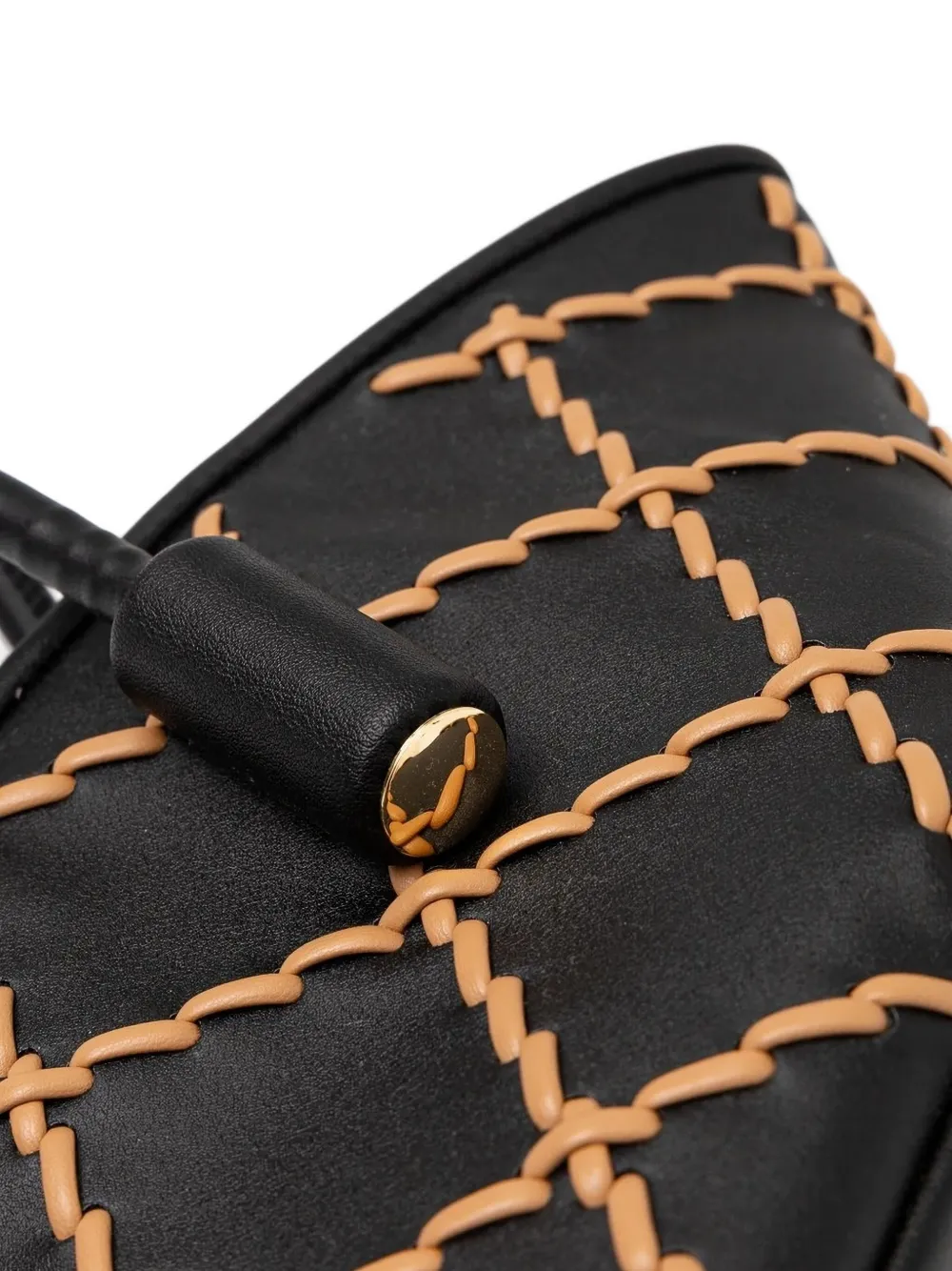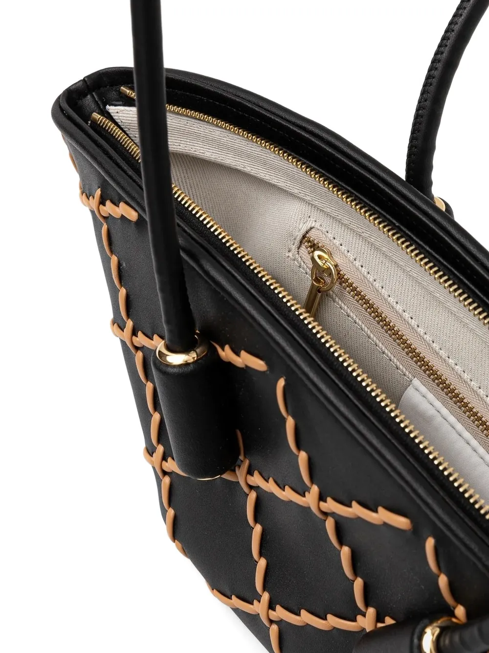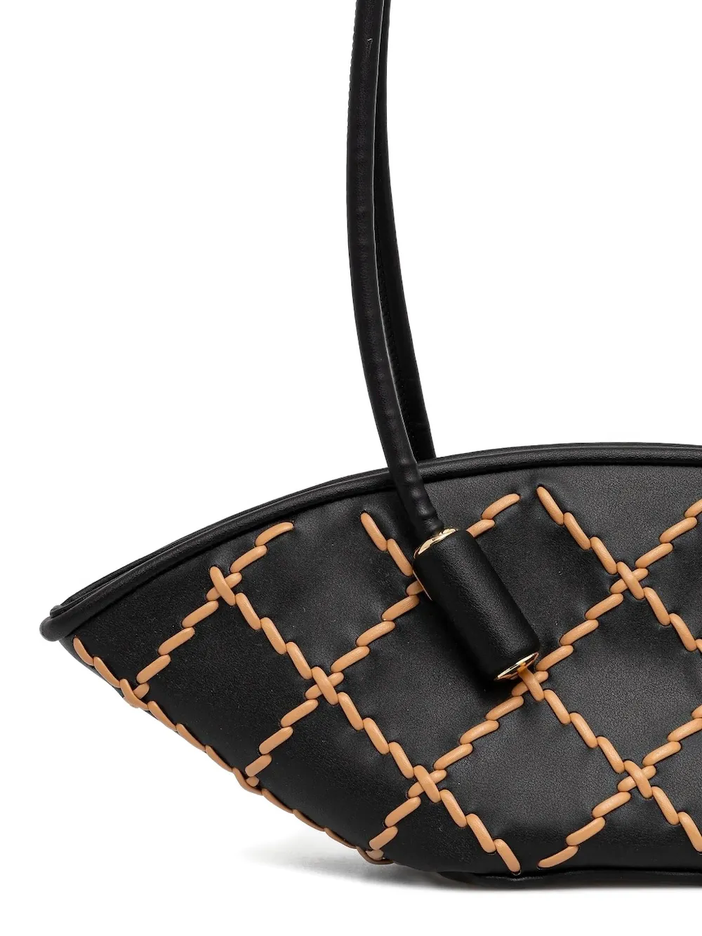Черные изогнутые ромбовидные верхние ручки, застежка-молния, золотистая фурнитура.