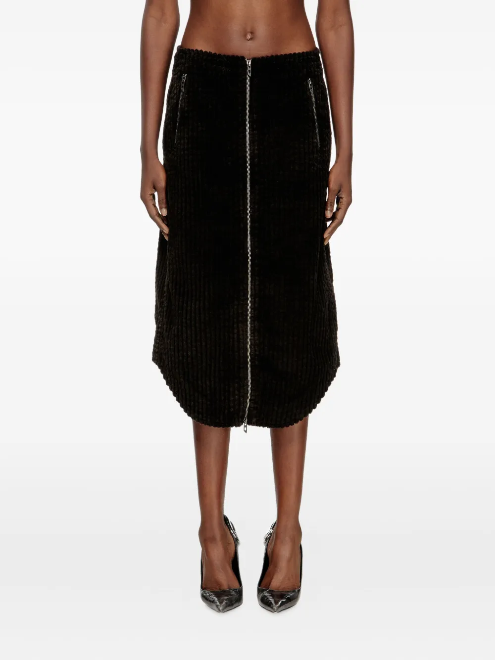 Черная вельветовая текстура, застежка-молния спереди, боковые карманы, закругленный край, приталенный пояс.