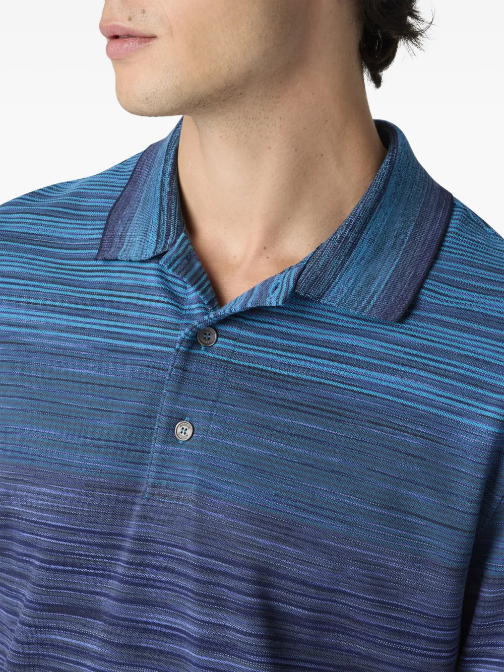 Синий полосатый узор с эффектом омбре, короткие рукава, планка на двух пуговицах, ребристый воротник. Полученный вами товар может немного отличаться от представленного на фотографии. Это связано с тем, что все изделия Missoni изготавливаются вручную.