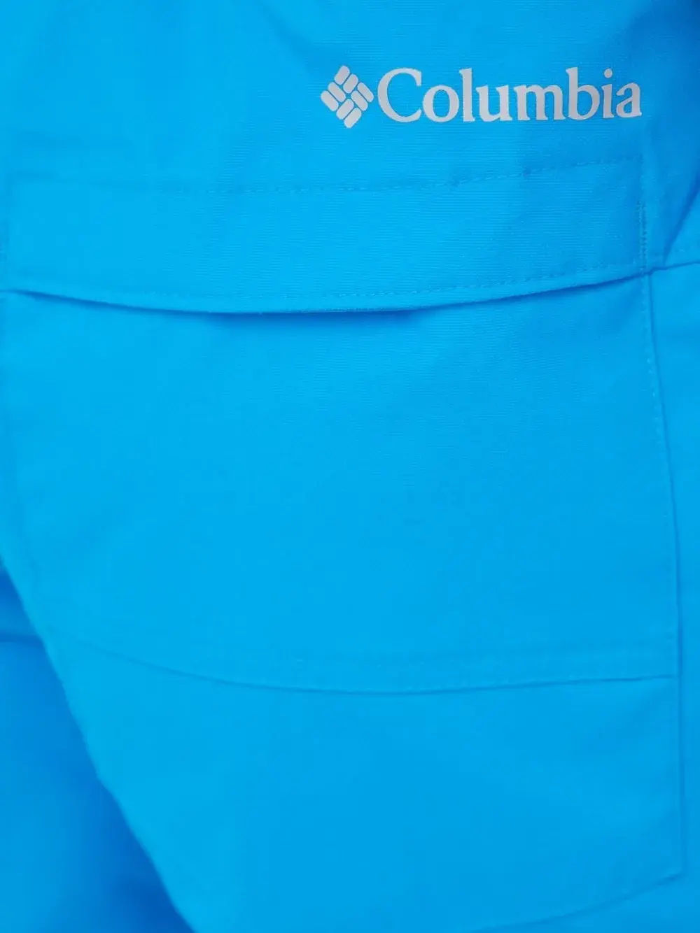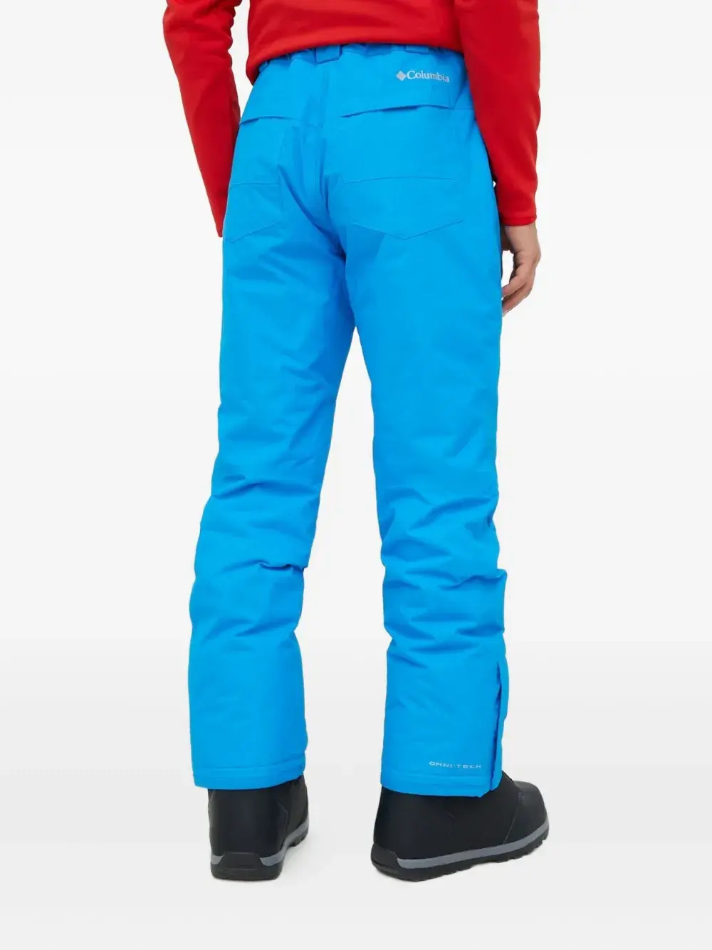 Ярко-синяя застежка на пуговицы, задний карман, молния на штанине, фирменная символика Omni-Tech