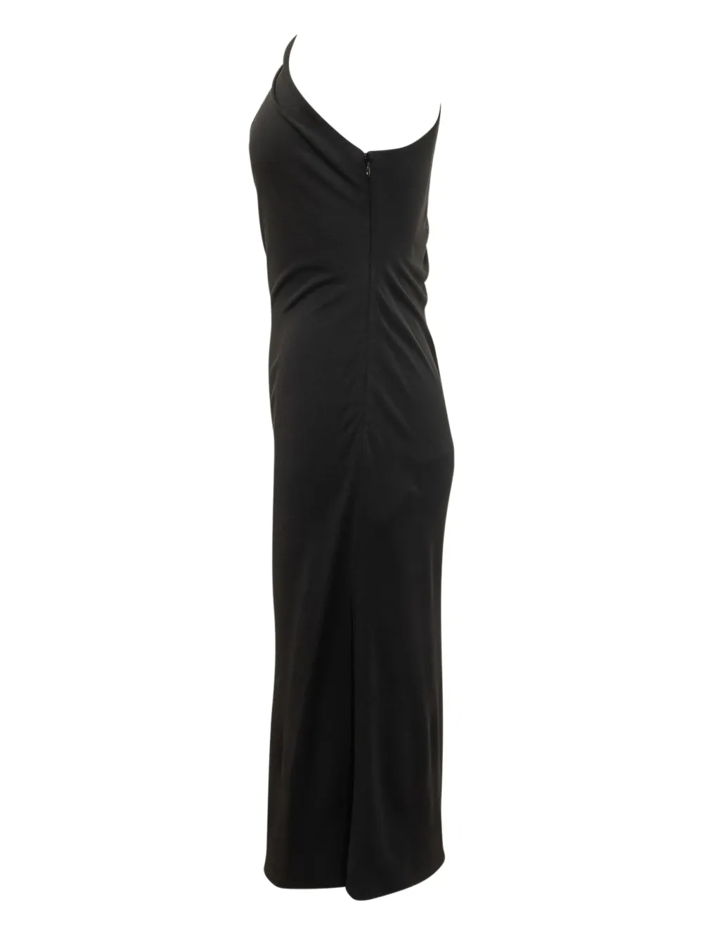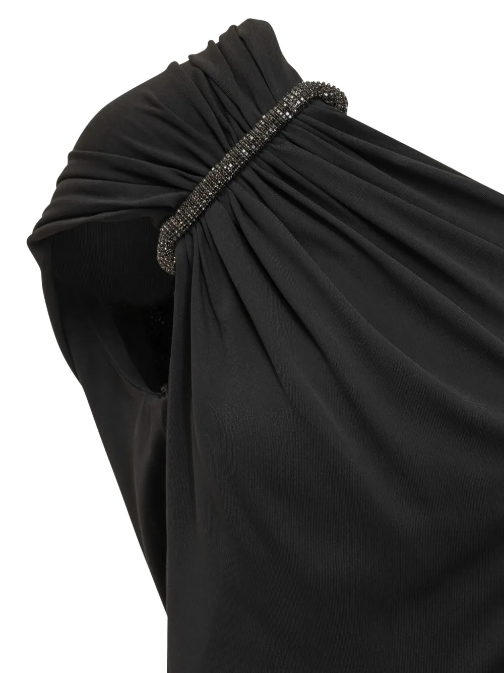 Черный вырез на одно плечо, драпированное плечо, отделка из стекла и латуни, потайная застежка-молния.