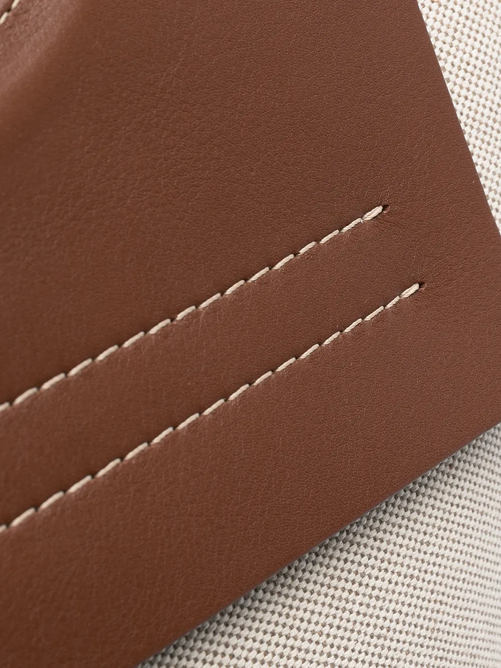 Кожаная отделка, две верхние ручки, основное отделение и дизайн с открытым верхом.