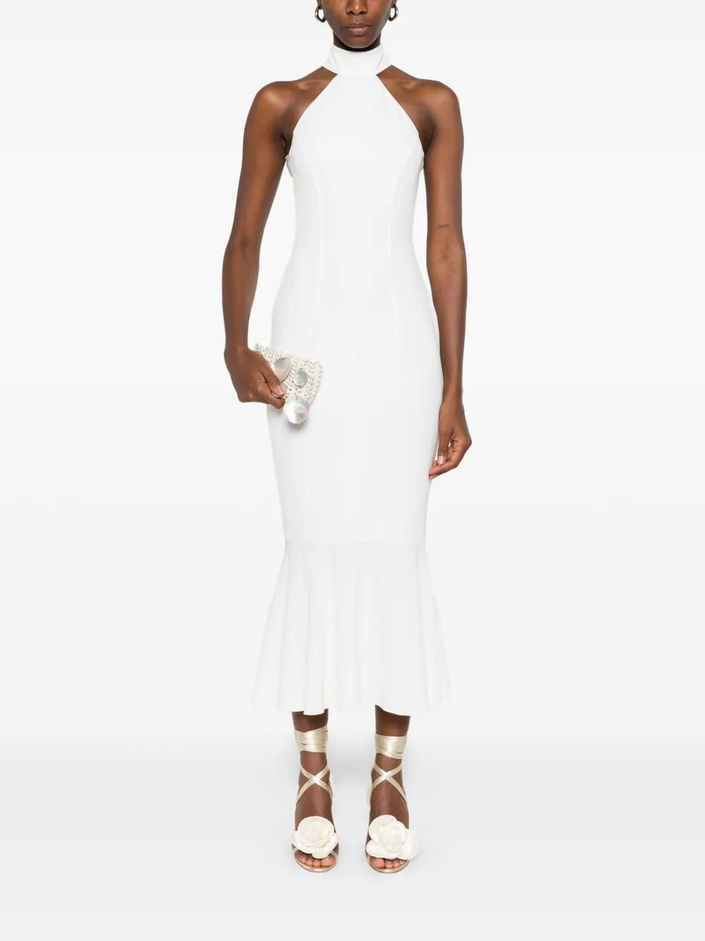 Белый, с открытой спиной, халтер-воротником, облегающим лифом и расклешенным подолом.