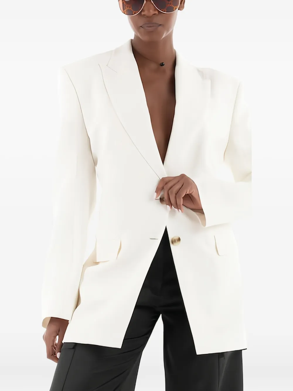 Однобортный пиджак бежевого цвета с застежкой на пуговицы, открытой спиной, подбитыми плечами, острыми лацканами и длинными рукавами.