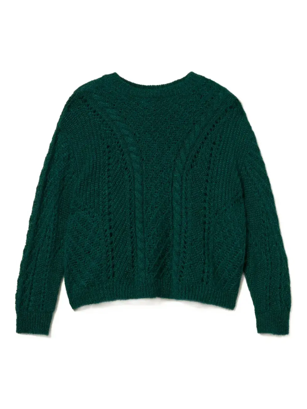 Зеленый ажурный узор из кос, круглый вырез, длинные рукава, свободный крой.