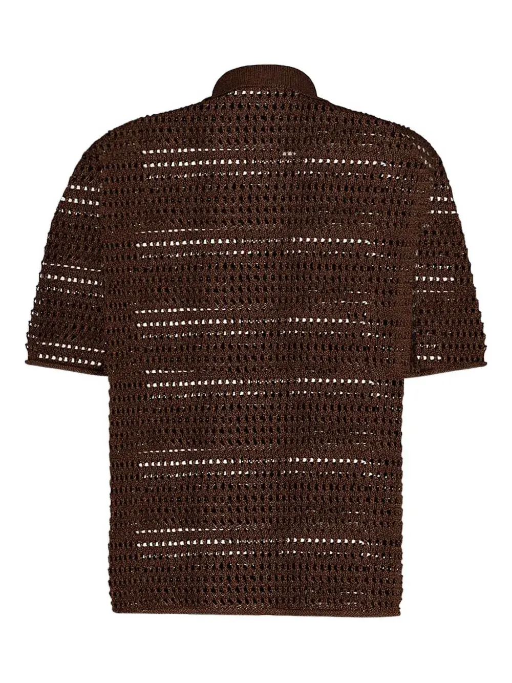 Коричневые короткие рукава, ажурный трикотажный воротник-поло, застежка на пуговицы.