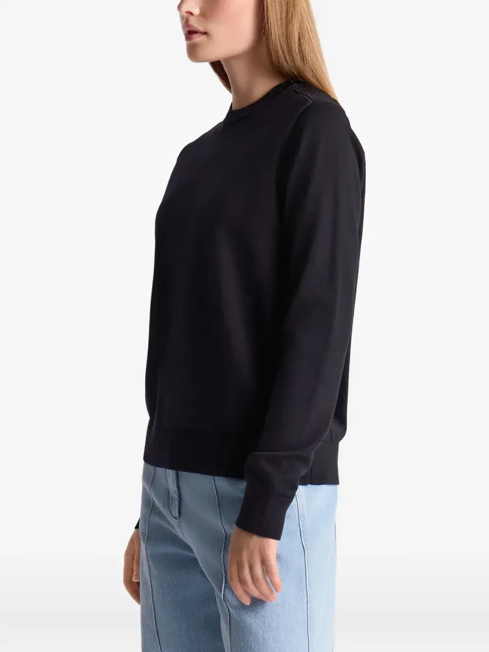 Черная шерстяная смесь, ребристые манжеты, ребристый подол, круглый вырез, логотип.
