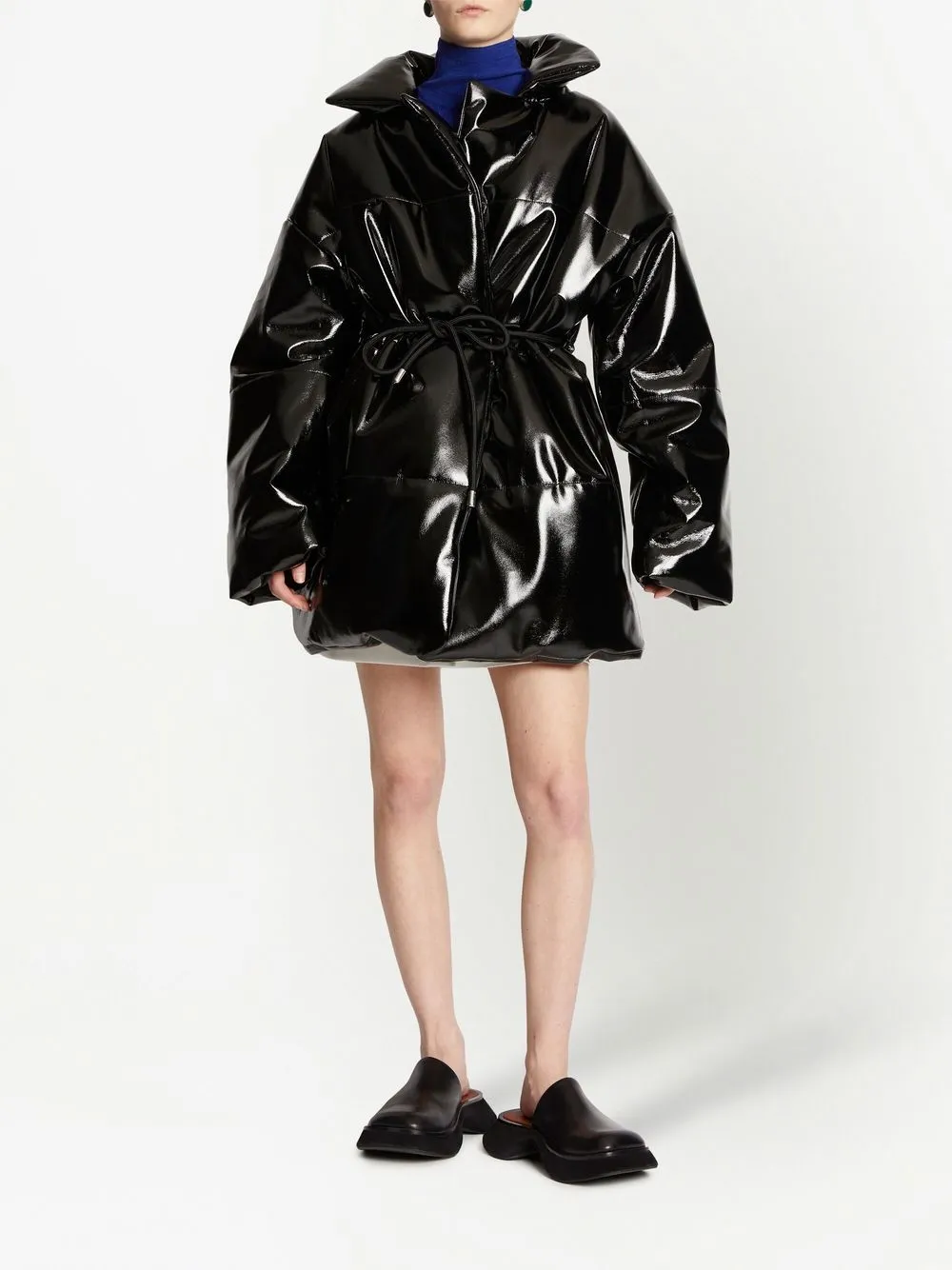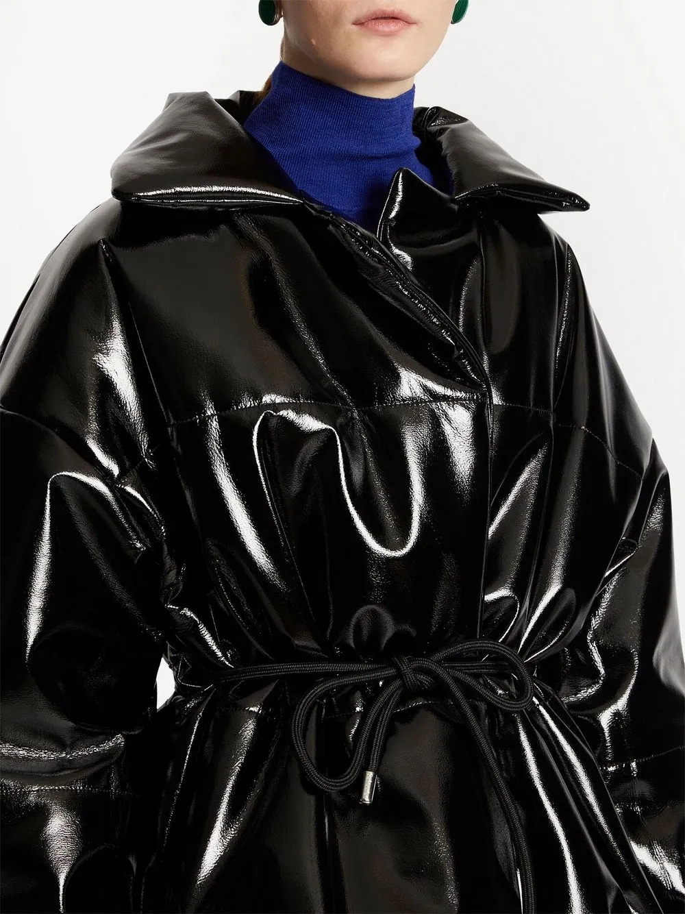 Черный, глянцевая фактура, классический воротник, ремень на талии и длинные рукава.